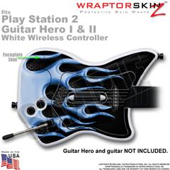 PS2 Guitar Hero I & II White Wireless Metal Flames Blue Skin