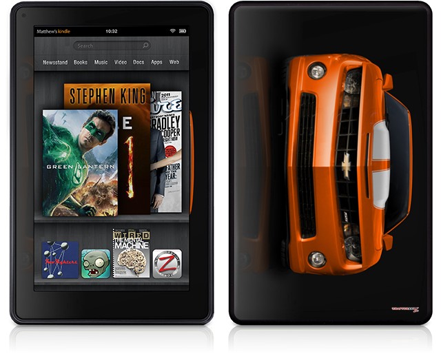 Amazon Kindle Fire (Original) Decal Style Skin - 2010 Chevy Camaro Orange - White Stripes on Black