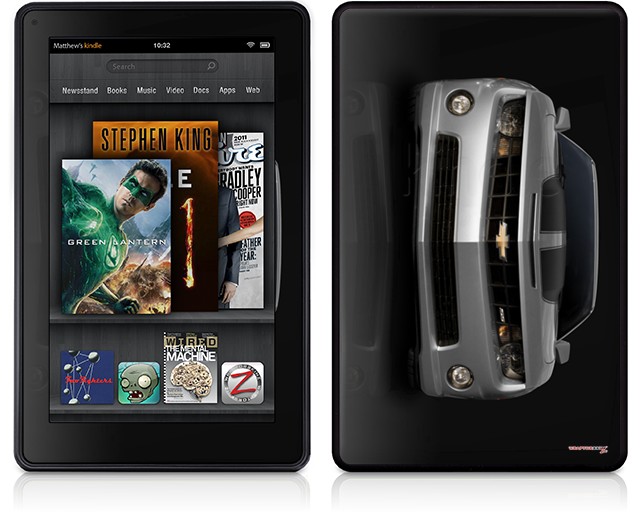 Amazon Kindle Fire (Original) Decal Style Skin - 2010 Chevy Camaro Silver - Black Stripes on Black