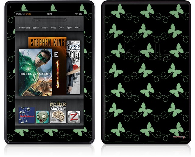 Amazon Kindle Fire (Original) Decal Style Skin - Pastel Butterflies Green on Black