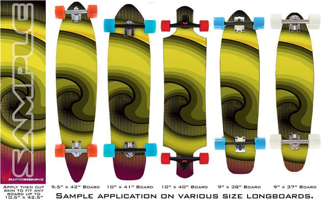Our longboard skins are made so that one size fits boards up to 10” wide x 42” long. This means after applying the skin it you will trimming to fit you’re the shape of your board with a sharp utility knife.