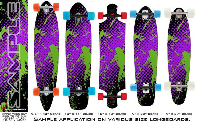 Our longboard skins are made so that one size fits boards up to 10” wide x 42” long. This means after applying the skin it you will trimming to fit you’re the shape of your board with a sharp utility knife.
