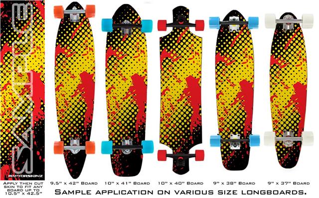Our longboard skins are made so that one size fits boards up to 10” wide x 42” long. This means after applying the skin it you will trimming to fit you’re the shape of your board with a sharp utility knife.