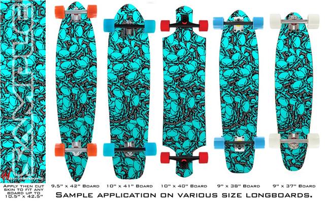 Our longboard skins are made so that one size fits boards up to 10” wide x 42” long. This means after applying the skin it you will trimming to fit you’re the shape of your board with a sharp utility knife.