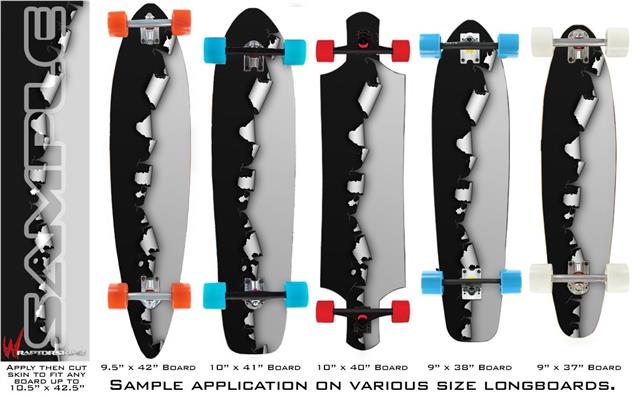 Our longboard skins are made so that one size fits boards up to 10” wide x 42” long. This means after applying the skin it you will trimming to fit you’re the shape of your board with a sharp utility knife.