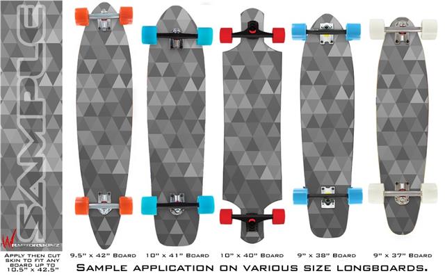 Our longboard skins are made so that one size fits boards up to 10” wide x 42” long. This means after applying the skin it you will trimming to fit you’re the shape of your board with a sharp utility knife.