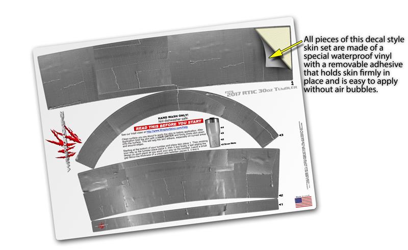 WraptorSkinz® skin wraps for 2017 RTIC Tumblers are printed using superb photo quality designs and vibrant colors printed with special fade resistant inks that last even in direct sun for years. WraptorSkinz® are a composite of two layers of commercial grade materials. The bottom layer is a soft, flexible vinyl with a special removable adhesive that is easily positioned, applied without air bubbles. Next we print the bottom layer with UV protected, fade resistant inks that deliver superb photo quality designs in vibrant colors. Finally we bond a professional grade laminate over the entire skin adding a glossy protective finish.