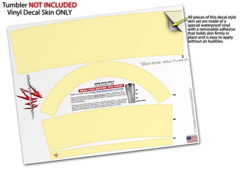 WraptorSkinz® skin wraps for 2017 RTIC Tumblers are printed using superb photo quality designs and vibrant colors printed with special fade resistant inks that last even in direct sun for years. WraptorSkinz® are a composite of two layers of commercial grade materials. The bottom layer is a soft, flexible vinyl with a special removable adhesive that is easily positioned, applied without air bubbles. Next we print the bottom layer with UV protected, fade resistant inks that deliver superb photo quality designs in vibrant colors. Finally we bond a professional grade laminate over the entire skin adding a glossy protective finish.