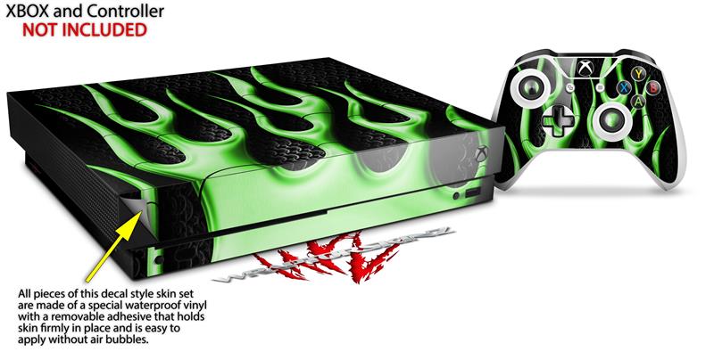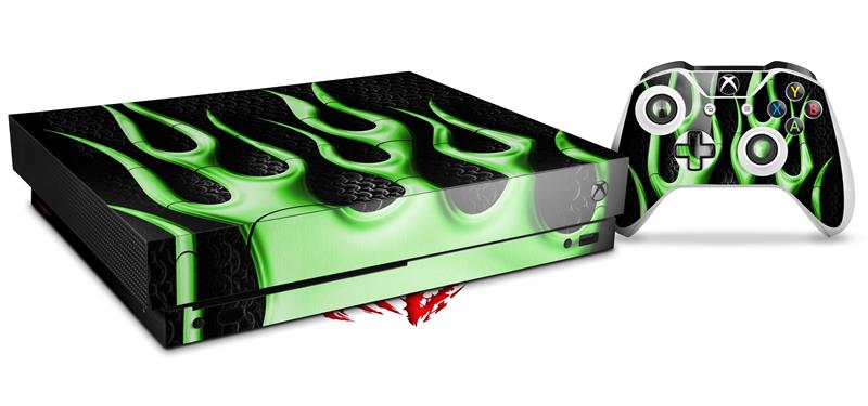 Skin Wrap compatible with XBOX One X Console and Controller Metal Flames Green