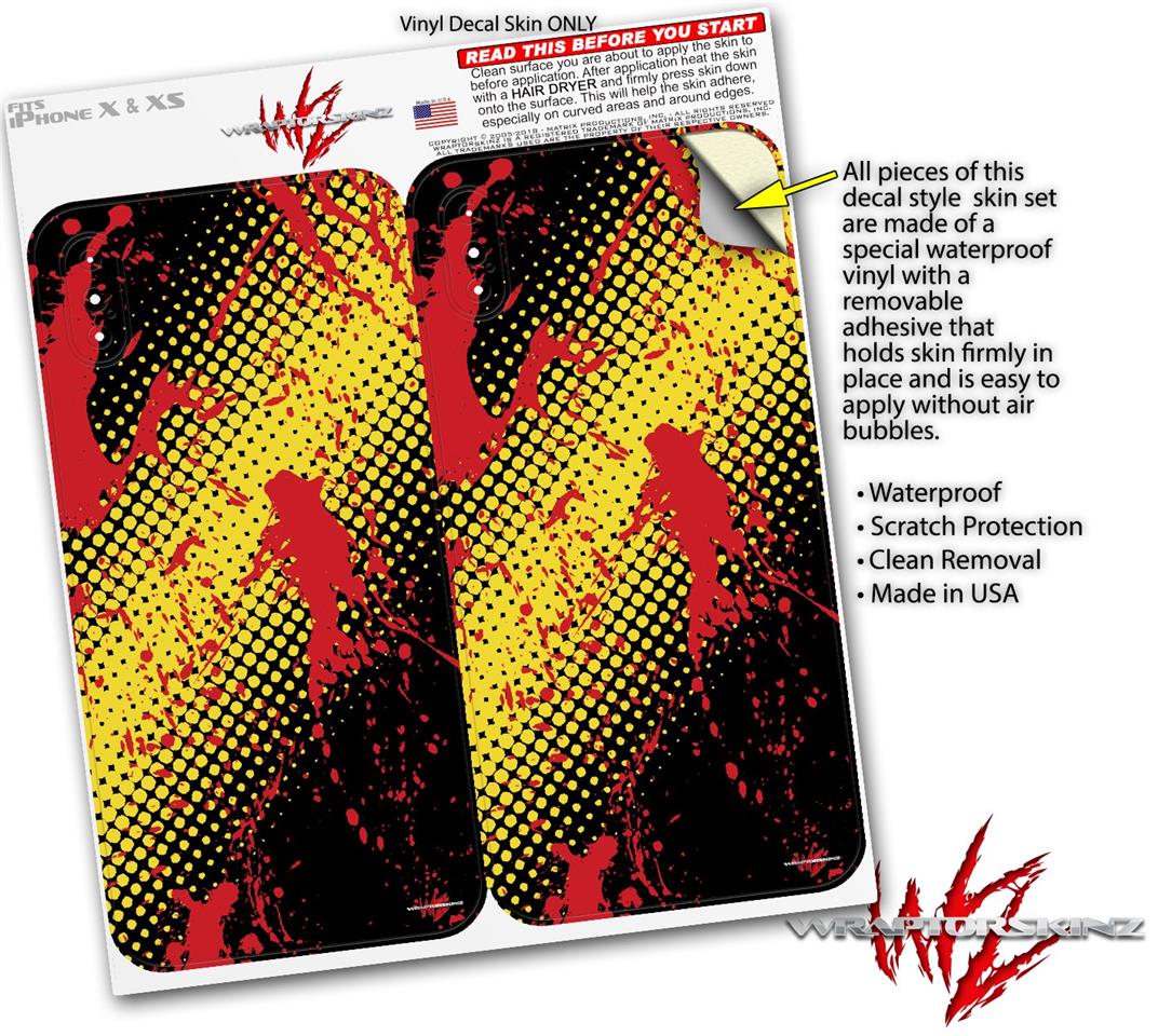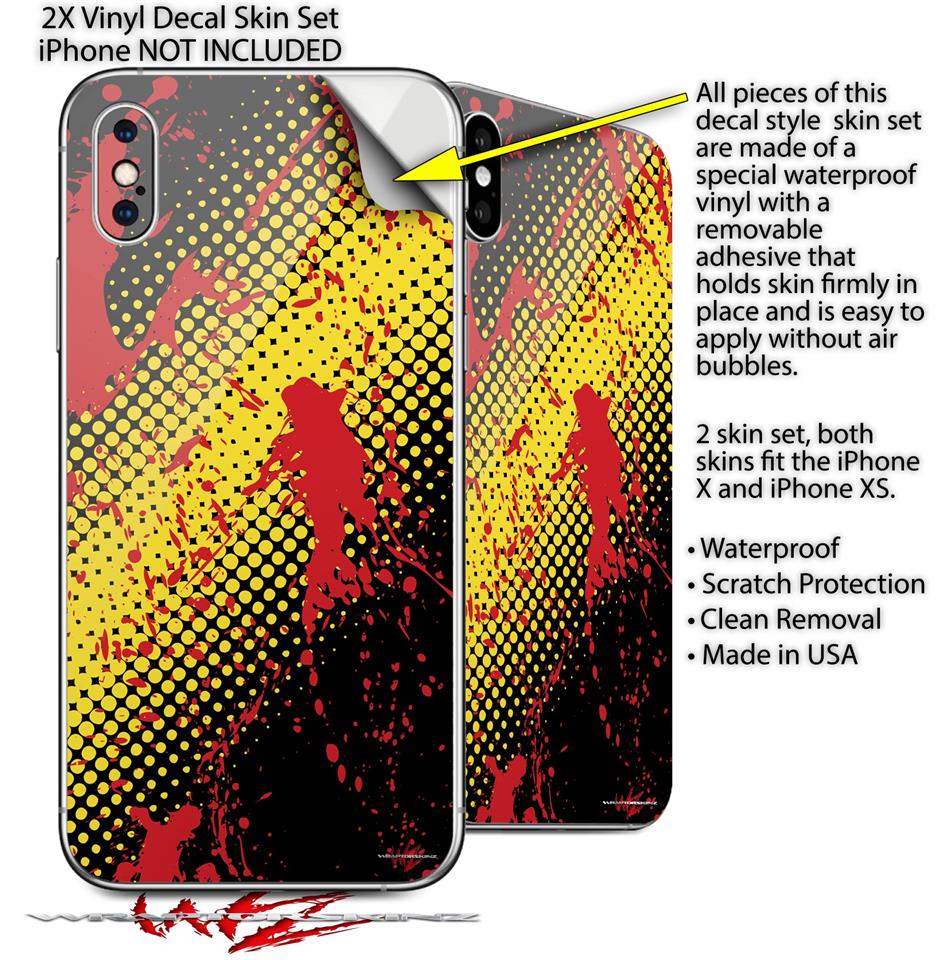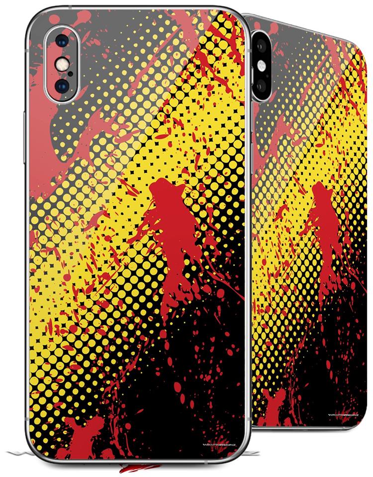 2 Decal style Skin Wraps set compatible with Apple iPhone X and XS Halftone Splatter Yellow Red
