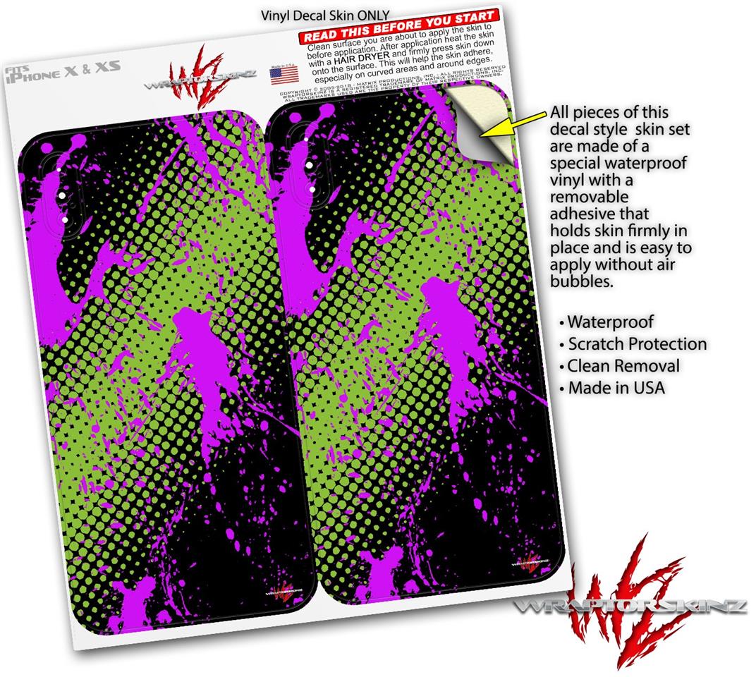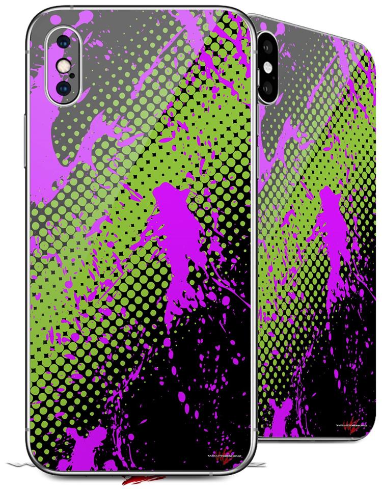 2 Decal style Skin Wraps set compatible with Apple iPhone X and XS Halftone Splatter Hot Pink Green