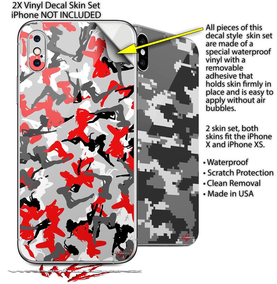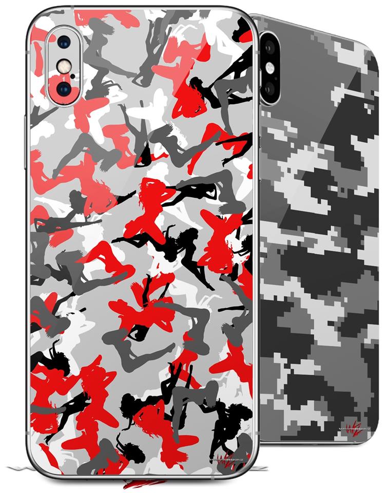 2 Decal style Skin Wraps set compatible with Apple iPhone X and XS Sexy Girl Silhouette Camo Red