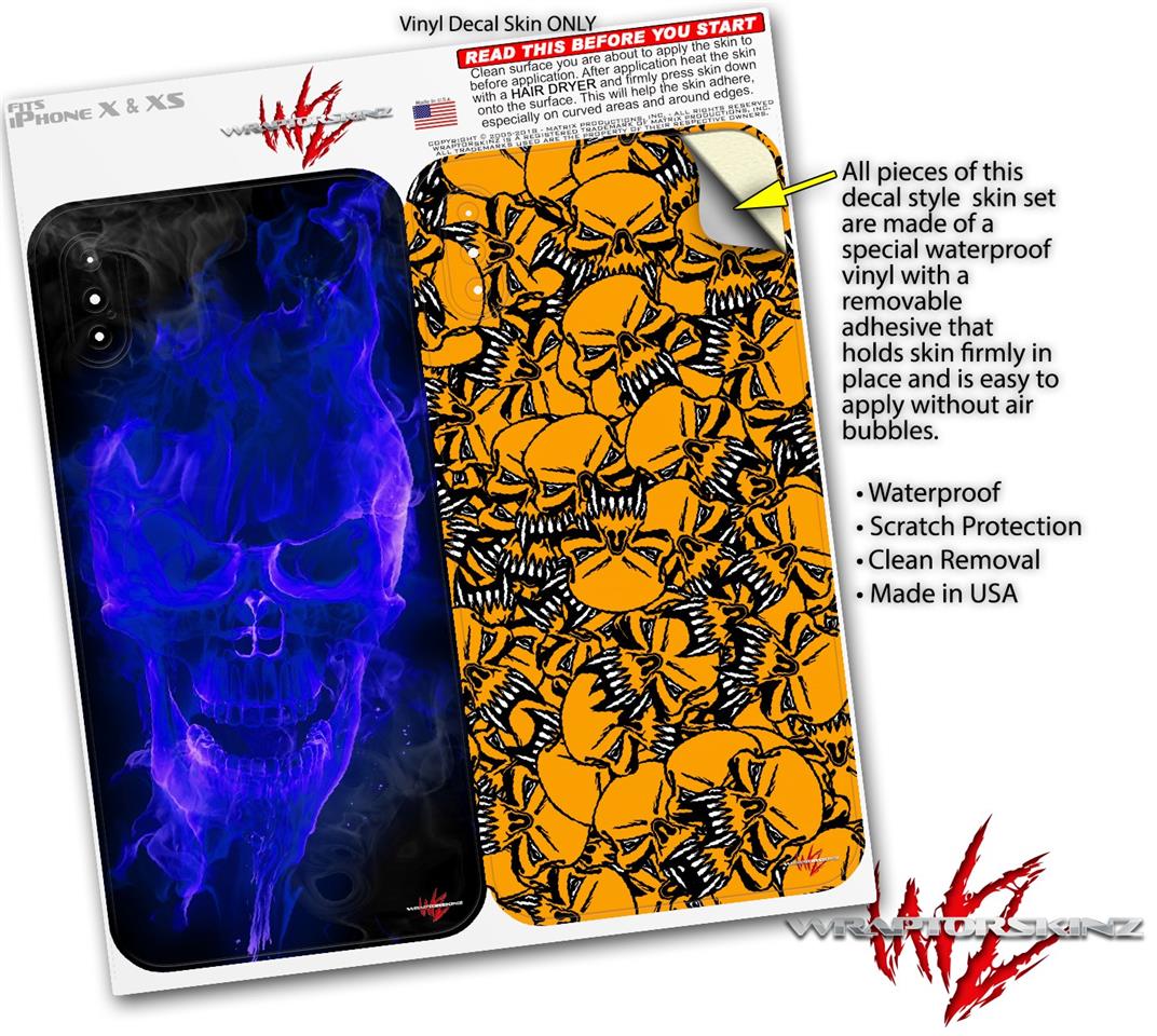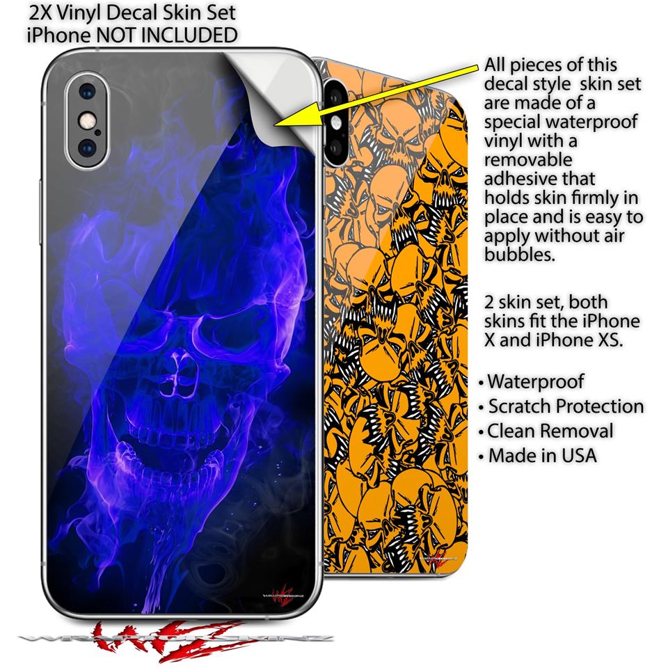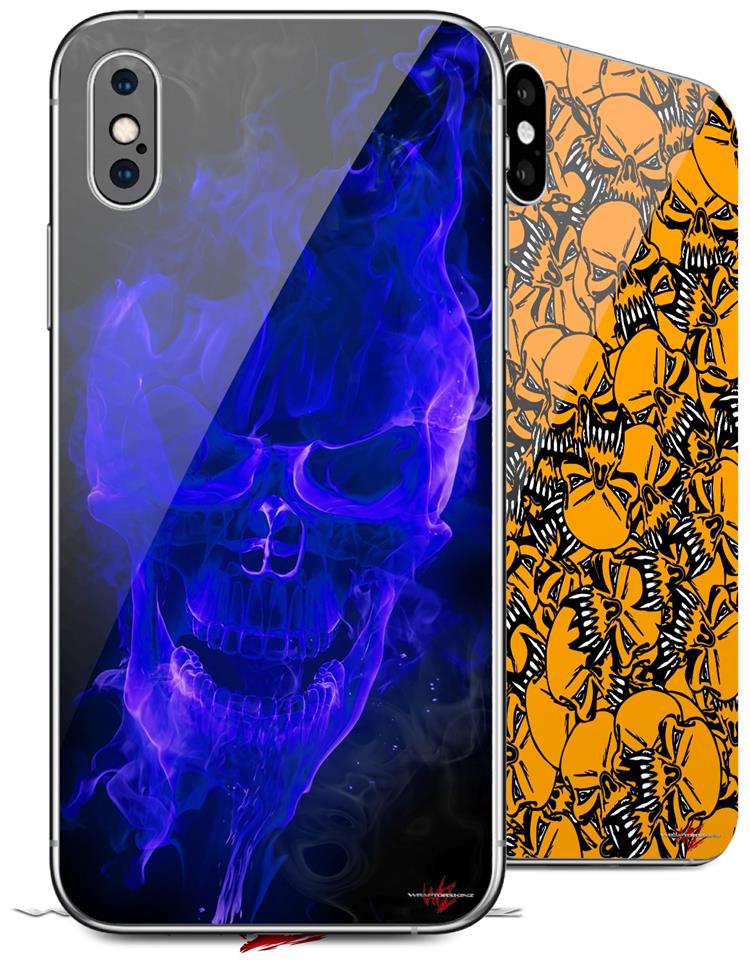2 Decal style Skin Wraps set compatible with Apple iPhone X and XS Flaming Fire Skull Blue