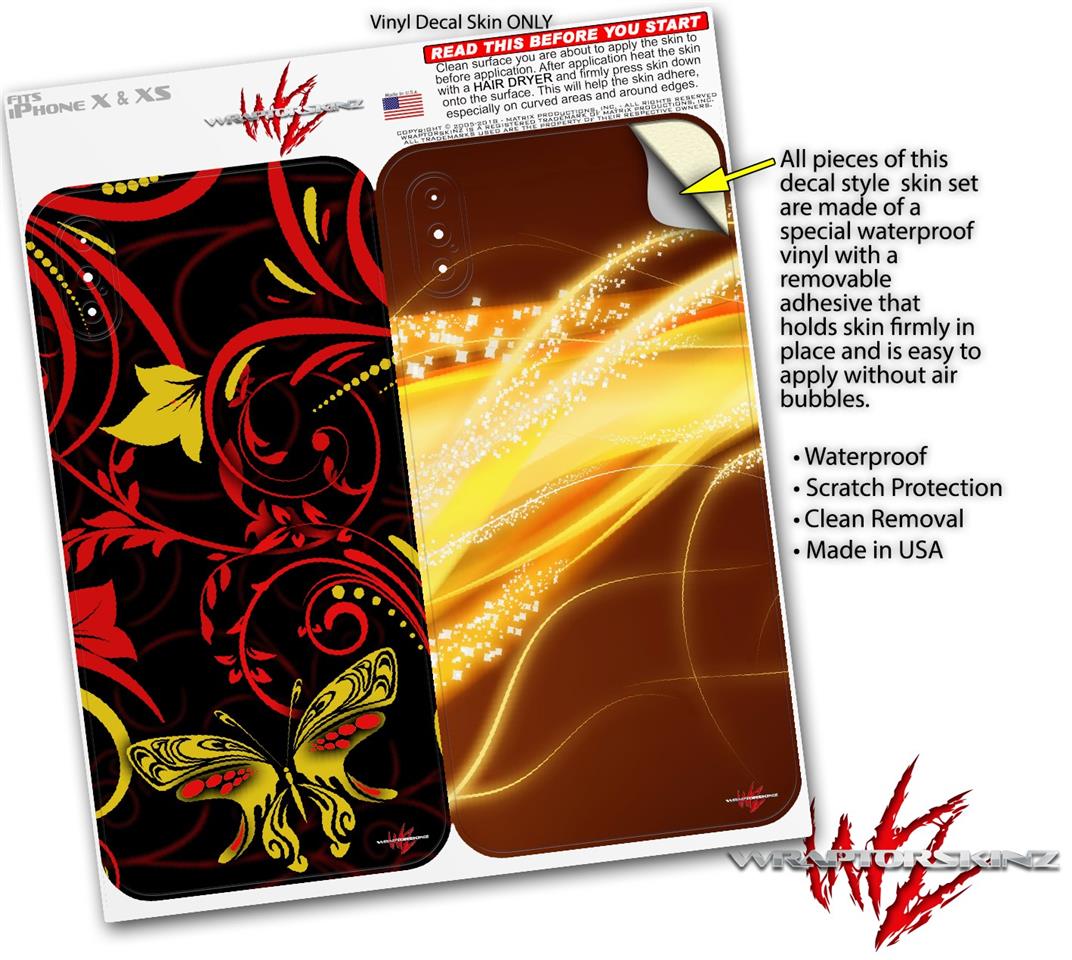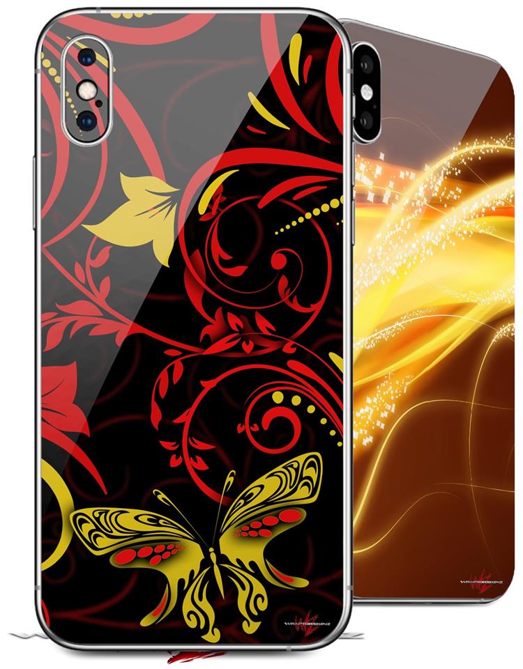 2 Decal style Skin Wraps set compatible with Apple iPhone X and XS Twisted Garden Red and Yellow