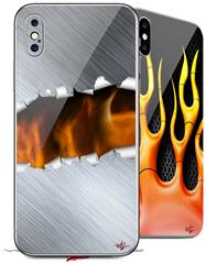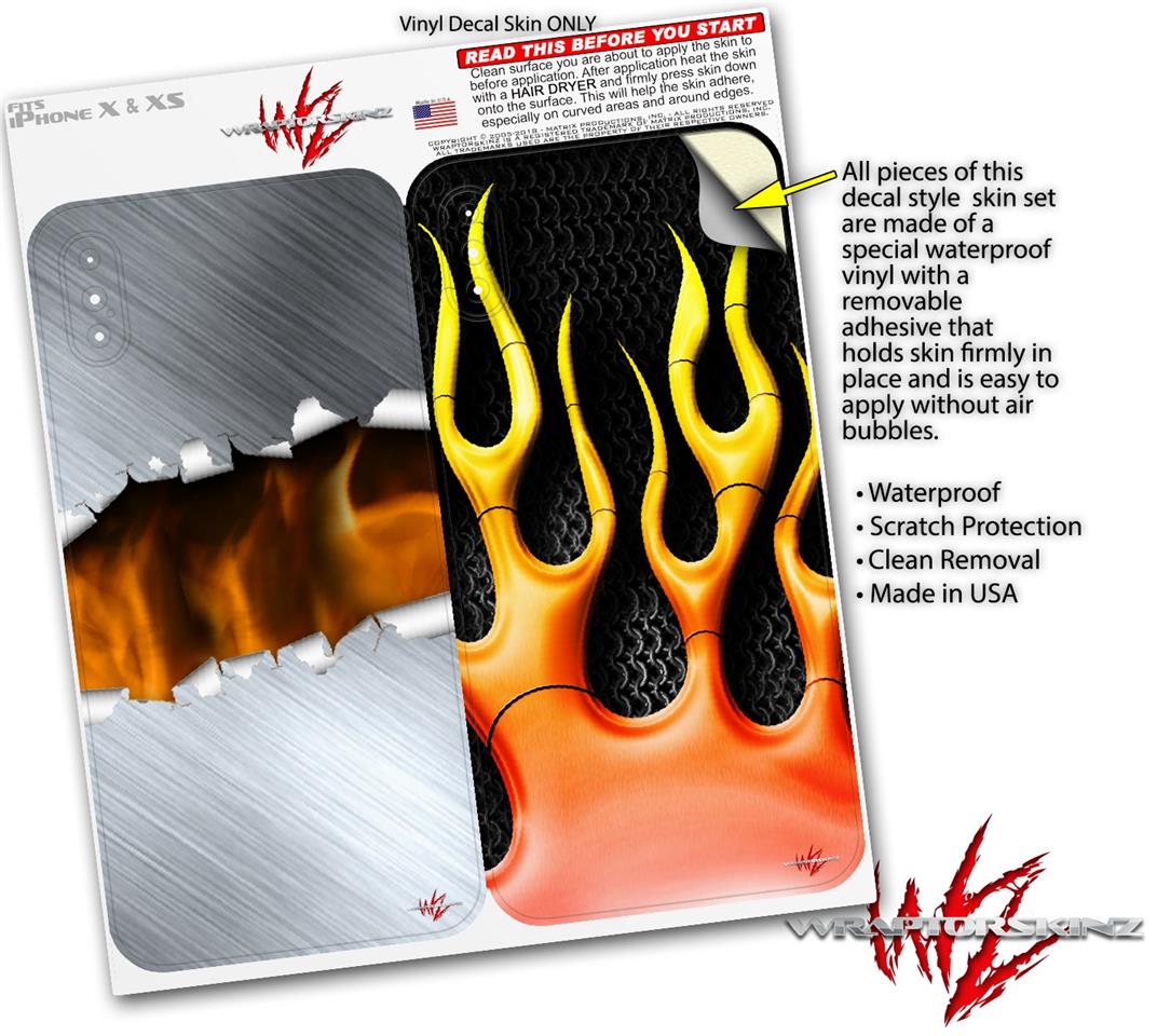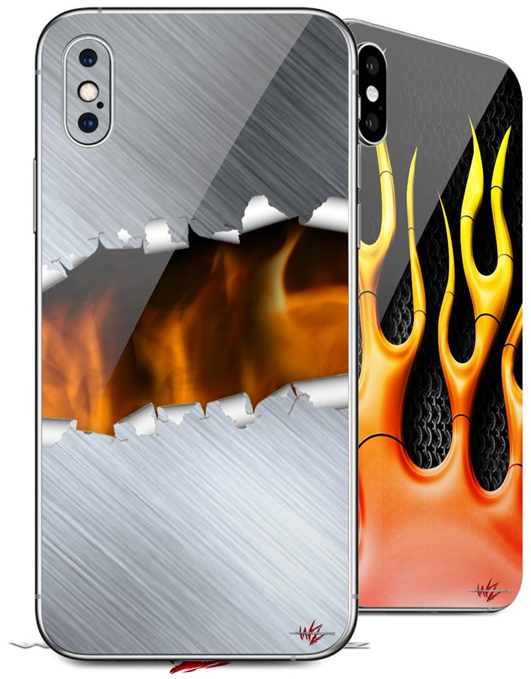 2 Decal style Skin Wraps set compatible with Apple iPhone X and XS Ripped Metal Fire