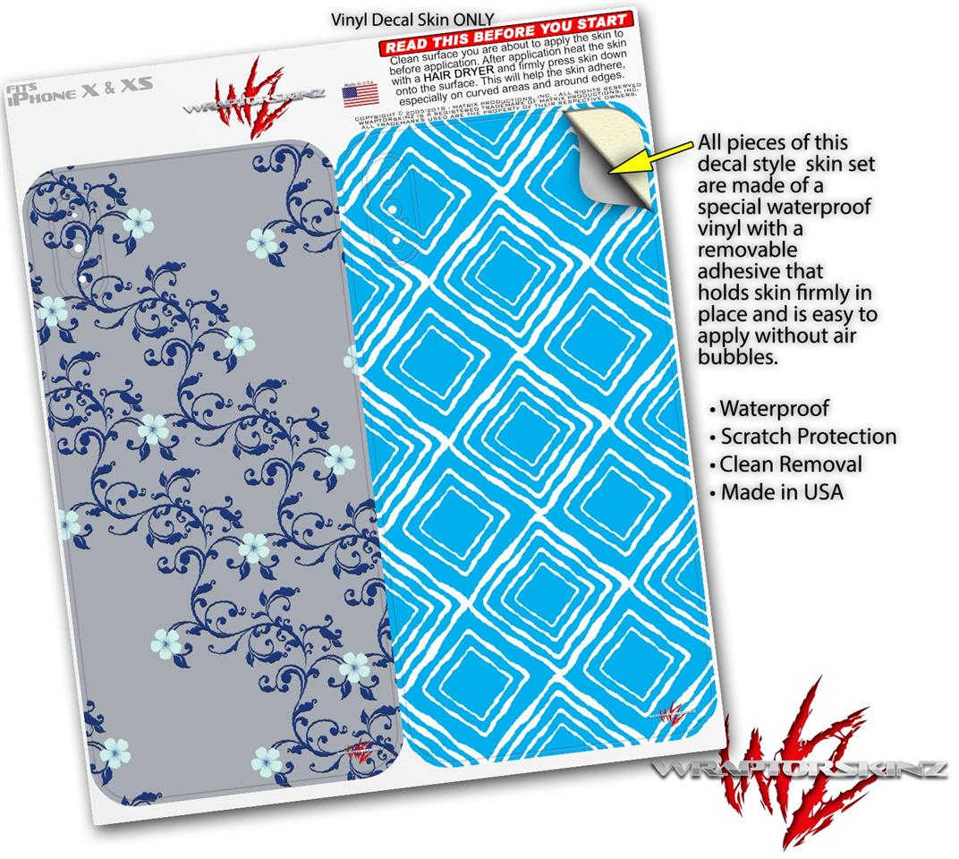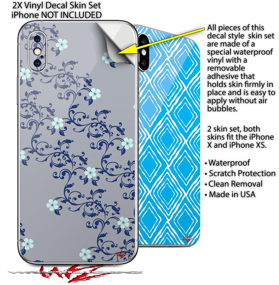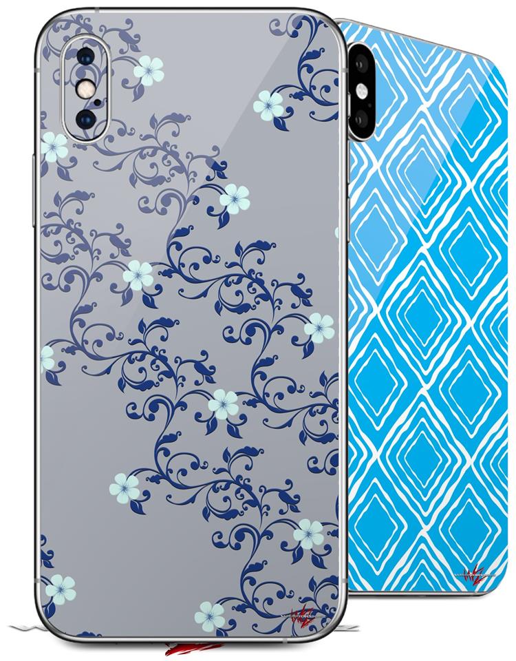 2 Decal style Skin Wraps set compatible with Apple iPhone X and XS Victorian Design Blue