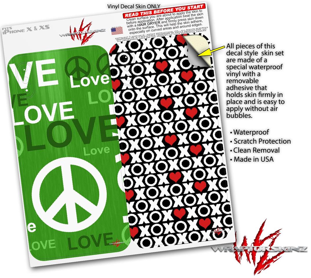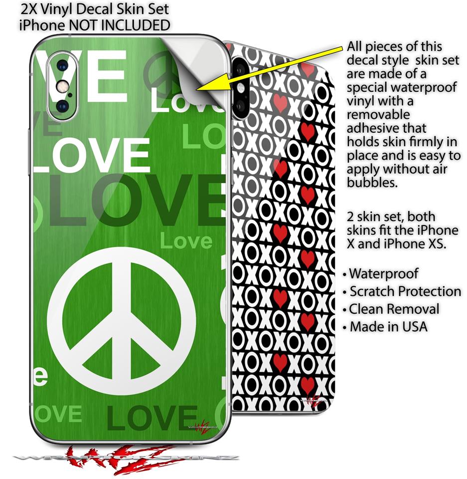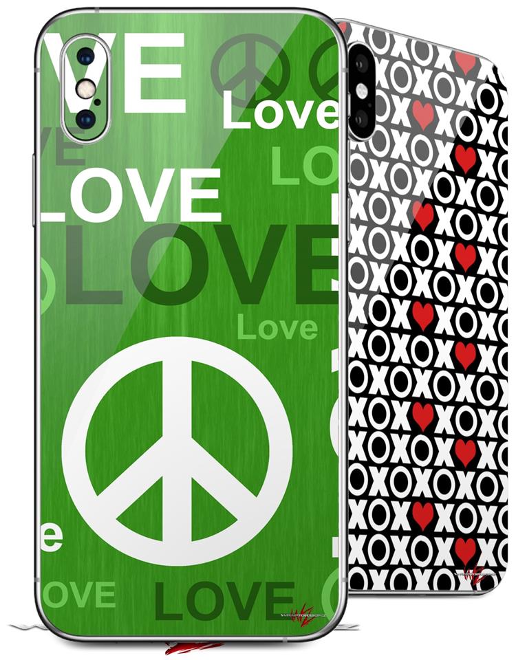 2 Decal style Skin Wraps set compatible with Apple iPhone X and XS Love and Peace Green