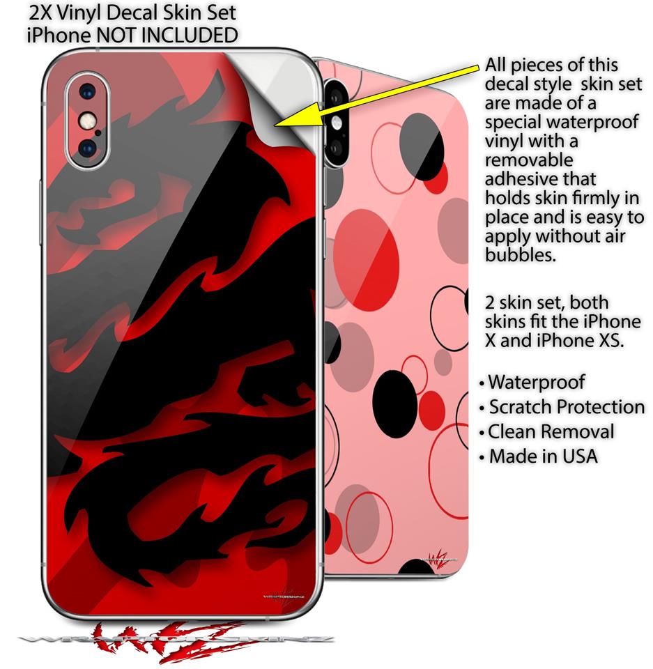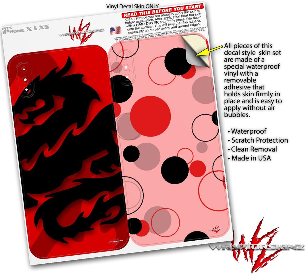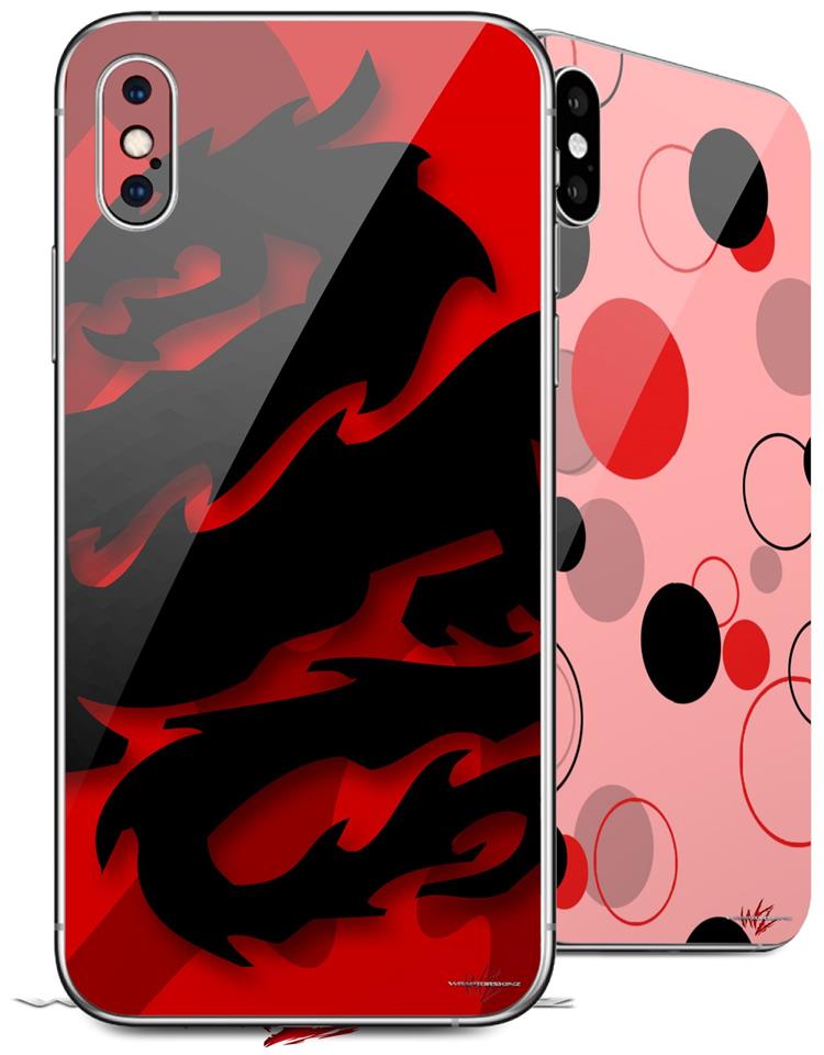 2 Decal style Skin Wraps set compatible with Apple iPhone X and XS Oriental Dragon Black on Red
