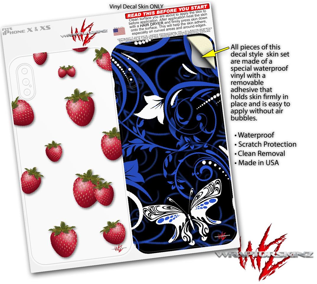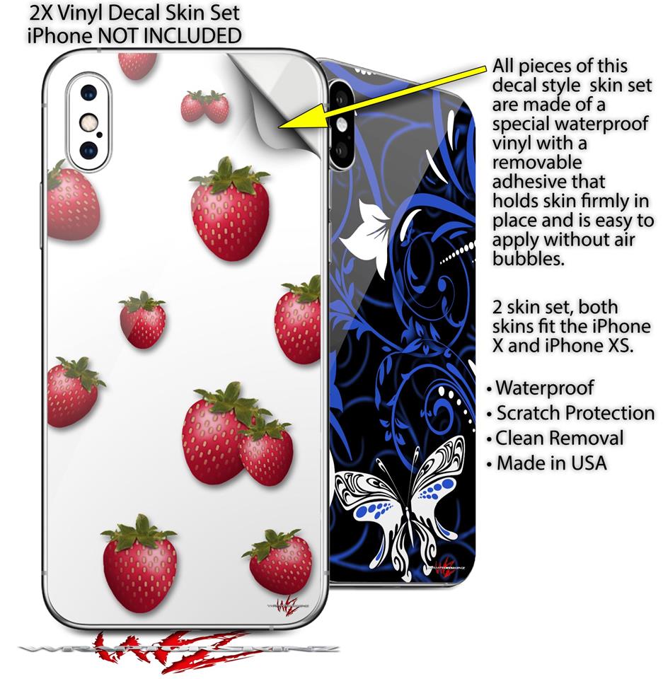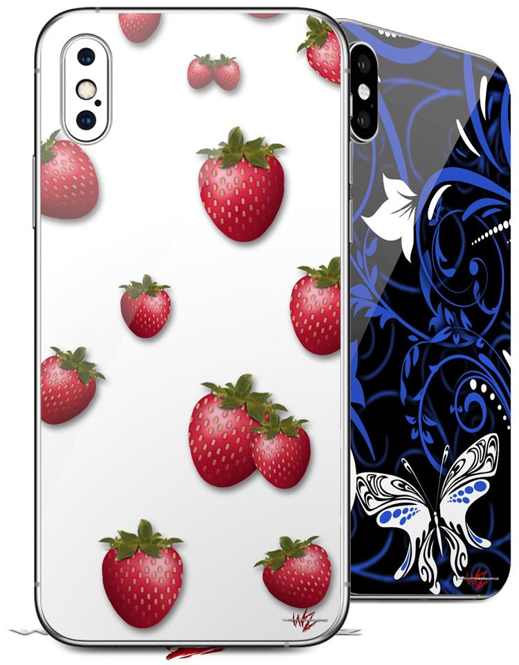 2 Decal style Skin Wraps set compatible with Apple iPhone X and XS Strawberries on White