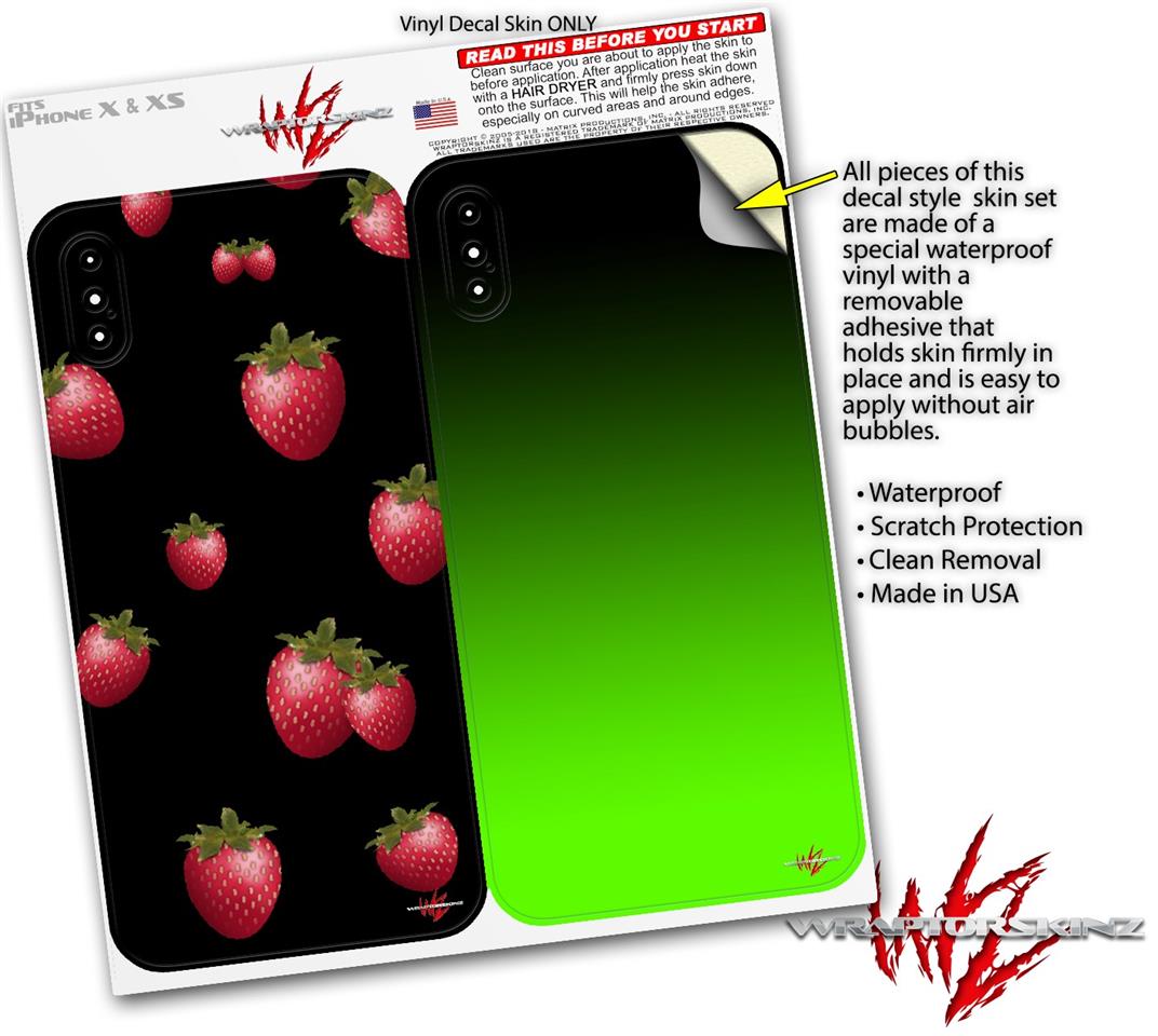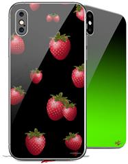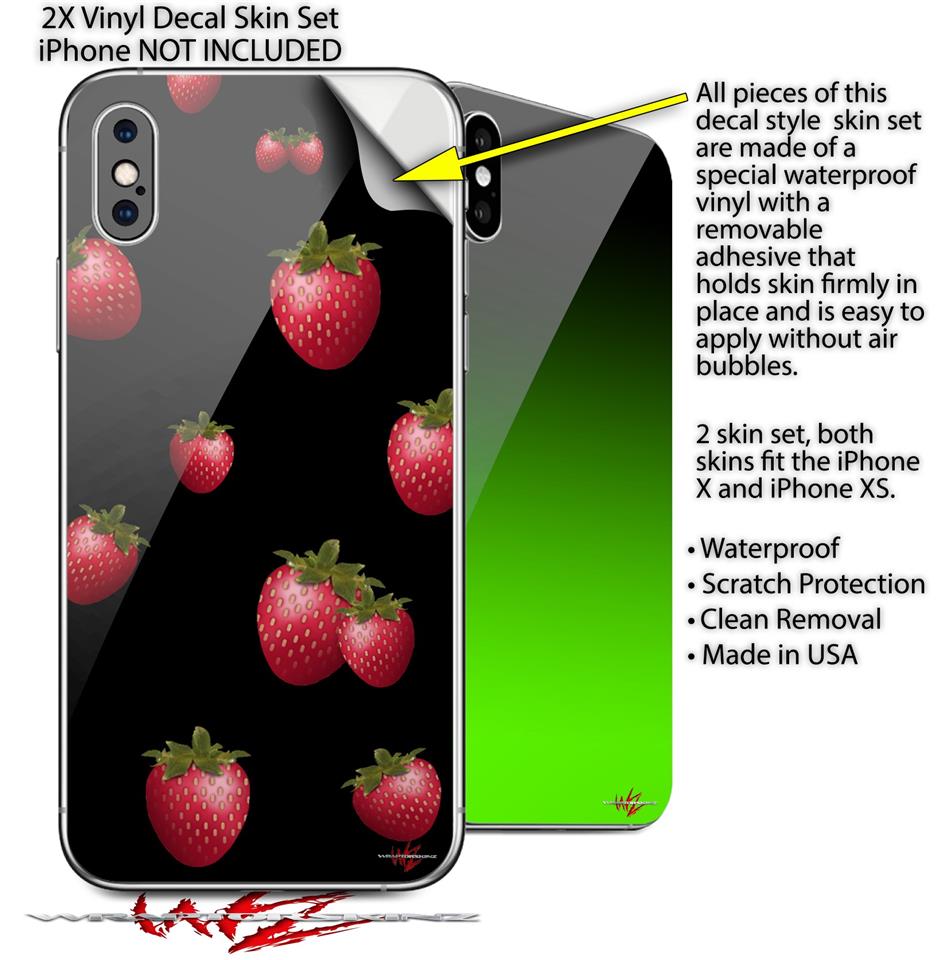 2 Decal style Skin Wraps set compatible with Apple iPhone X and XS Strawberries on Black
