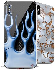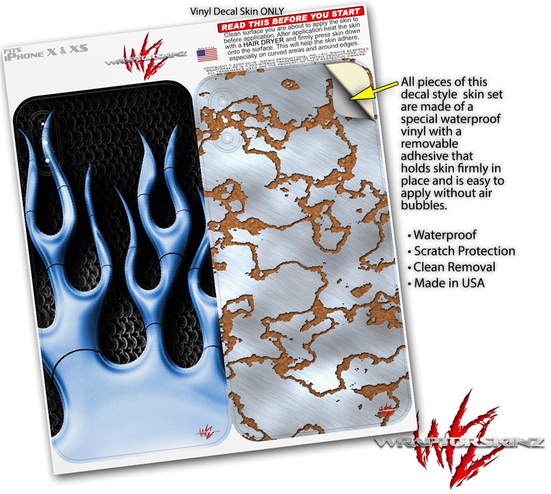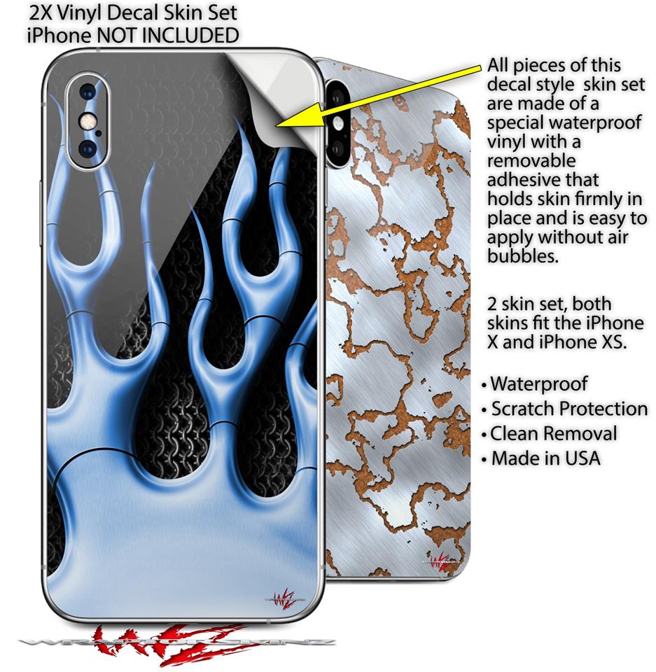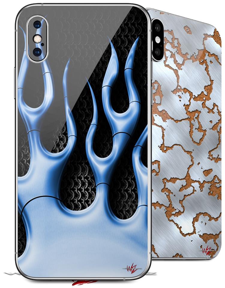 2 Decal style Skin Wraps set compatible with Apple iPhone X and XS Metal Flames Blue