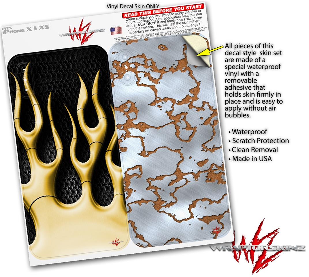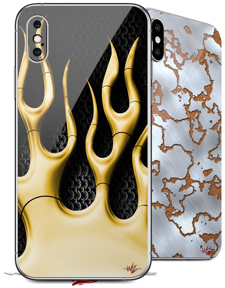 2 Decal style Skin Wraps set compatible with Apple iPhone X and XS Metal Flames Yellow