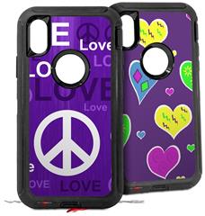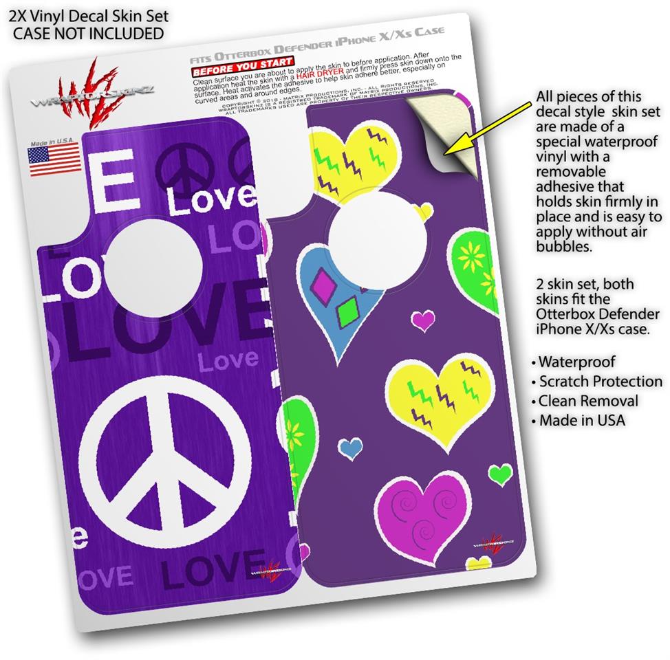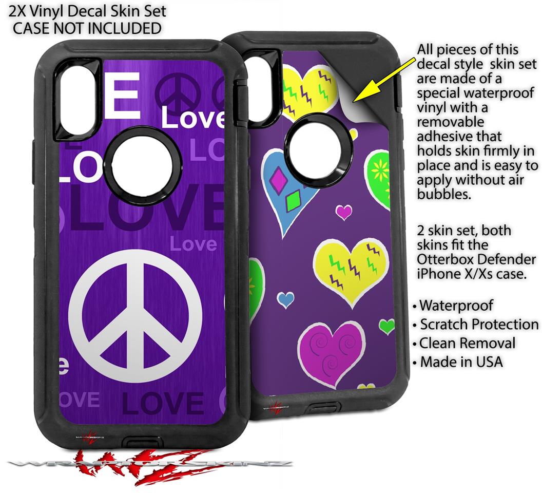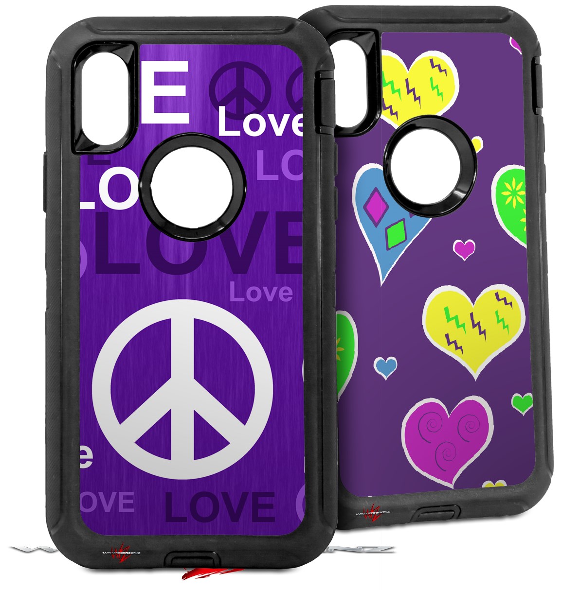 2x Decal style Skin Wrap Set compatible with Otterbox Defender iPhone X and Xs Case - Love and Peace Purple (CASE NOT INCLUDED)