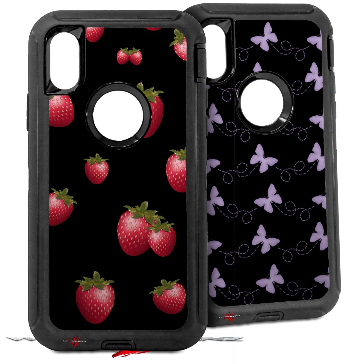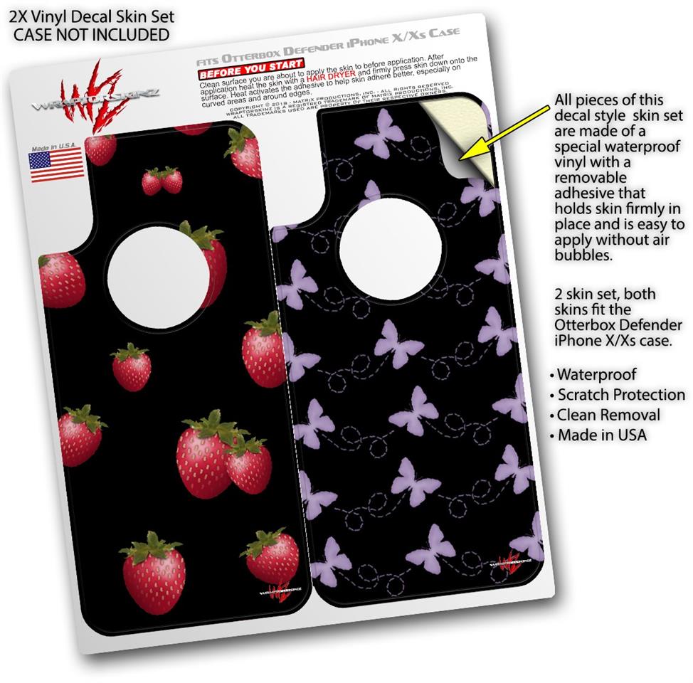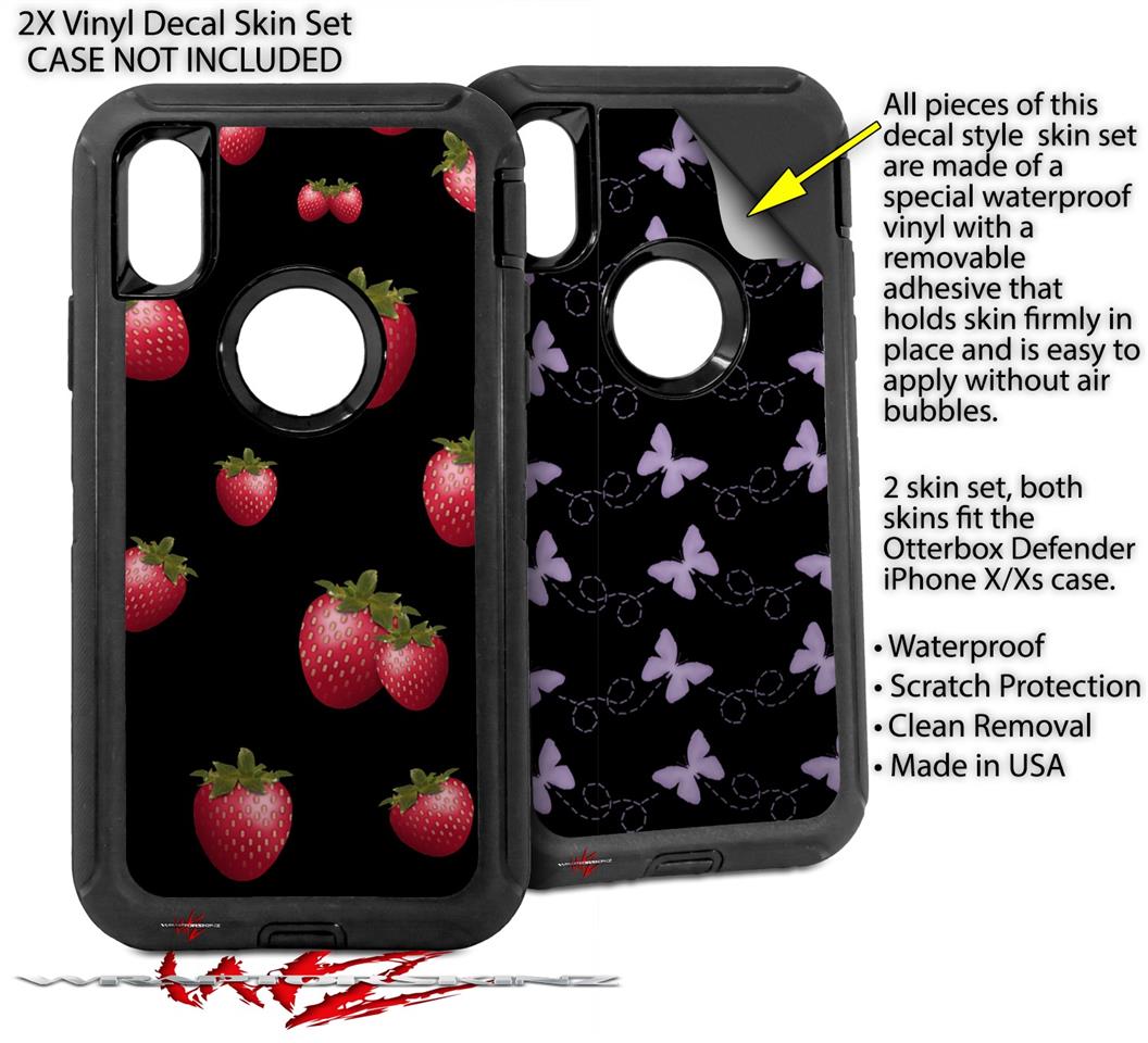 2x Decal style Skin Wrap Set compatible with Otterbox Defender iPhone X and Xs Case - Strawberries on Black (CASE NOT INCLUDED)