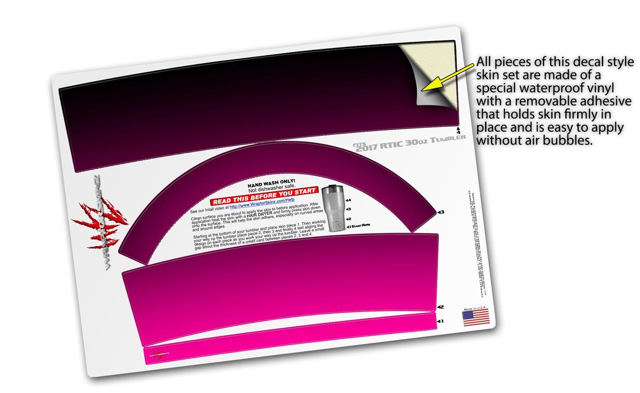 WraptorSkinz® skin wraps for 2017 RTIC Tumblers are printed using superb photo quality designs and vibrant colors printed with special fade resistant inks that last even in direct sun for years. WraptorSkinz® are a composite of two layers of commercial grade materials. The bottom layer is a soft, flexible vinyl with a special removable adhesive that is easily positioned, applied without air bubbles. Next we print the bottom layer with UV protected, fade resistant inks that deliver superb photo quality designs in vibrant colors. Finally we bond a professional grade laminate over the entire skin adding a glossy protective finish.