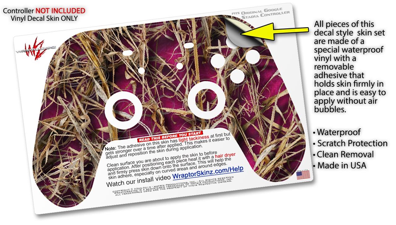 This product is in no way affiliated with or endorsed by Google. WraptorSkinz® skin wraps work with the Original Google Stadia version 1 Controller. Printed using superb photo quality designs and vibrant colors printed with special fade resistant inks that last even in direct sun for years. WraptorSkinz are a composite of two layers of commercial grade materials. The bottom layer is a soft, flexible vinyl with a special removable adhesive that is easily positioned, applied without air bubbles. Next, we print the bottom layer with UV protected, fade resistant inks that deliver superb photo quality designs in vibrant colors. Finally, we bond a professional grade laminate over the entire skin adding a glossy protective finish.