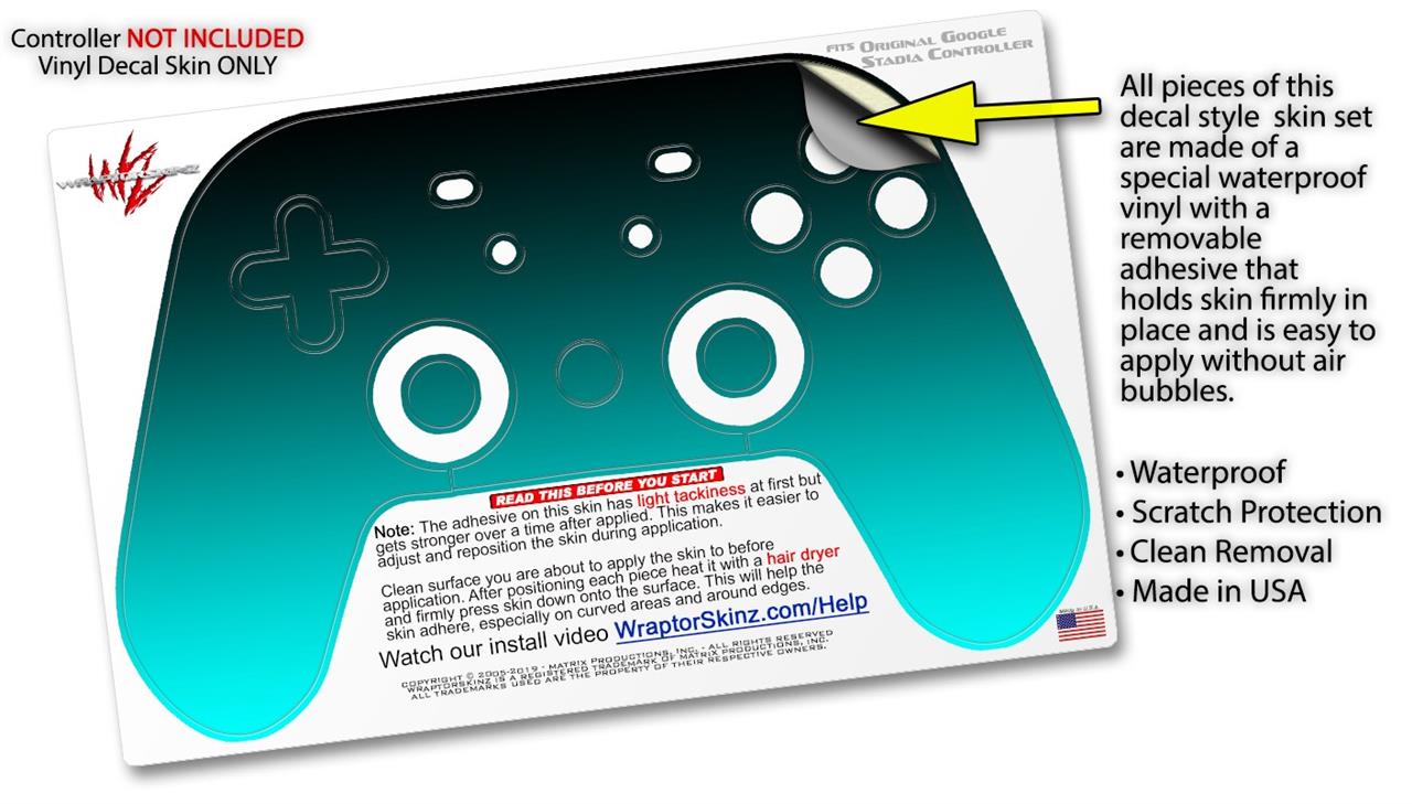 This product is in no way affiliated with or endorsed by Google. WraptorSkinz® skin wraps work with the Original Google Stadia version 1 Controller. Printed using superb photo quality designs and vibrant colors printed with special fade resistant inks that last even in direct sun for years. WraptorSkinz are a composite of two layers of commercial grade materials. The bottom layer is a soft, flexible vinyl with a special removable adhesive that is easily positioned, applied without air bubbles. Next, we print the bottom layer with UV protected, fade resistant inks that deliver superb photo quality designs in vibrant colors. Finally, we bond a professional grade laminate over the entire skin adding a glossy protective finish.