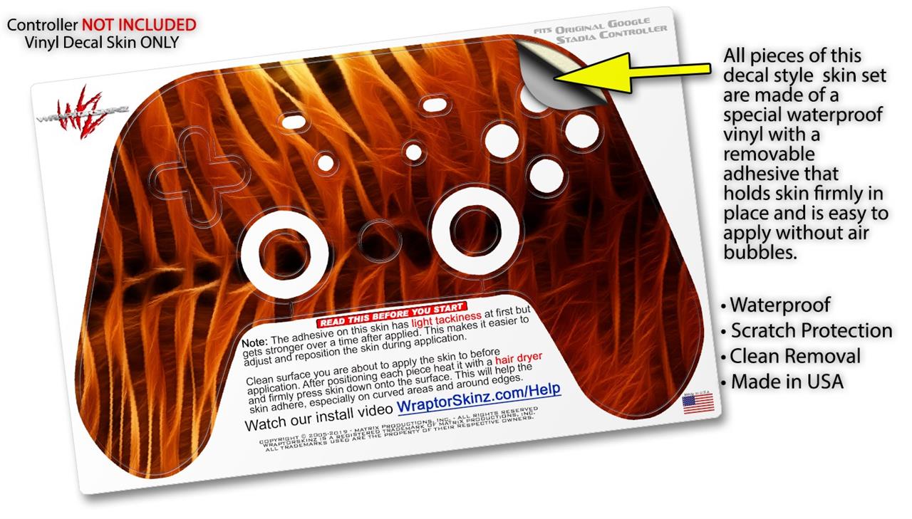 This product is in no way affiliated with or endorsed by Google. WraptorSkinz® skin wraps work with the Original Google Stadia version 1 Controller. Printed using superb photo quality designs and vibrant colors printed with special fade resistant inks that last even in direct sun for years. WraptorSkinz are a composite of two layers of commercial grade materials. The bottom layer is a soft, flexible vinyl with a special removable adhesive that is easily positioned, applied without air bubbles. Next, we print the bottom layer with UV protected, fade resistant inks that deliver superb photo quality designs in vibrant colors. Finally, we bond a professional grade laminate over the entire skin adding a glossy protective finish.