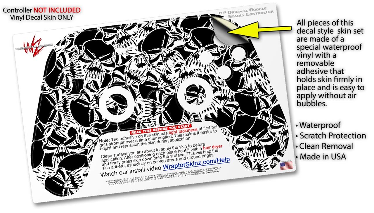 This product is in no way affiliated with or endorsed by Google. WraptorSkinz® skin wraps work with the Original Google Stadia version 1 Controller. Printed using superb photo quality designs and vibrant colors printed with special fade resistant inks that last even in direct sun for years. WraptorSkinz are a composite of two layers of commercial grade materials. The bottom layer is a soft, flexible vinyl with a special removable adhesive that is easily positioned, applied without air bubbles. Next, we print the bottom layer with UV protected, fade resistant inks that deliver superb photo quality designs in vibrant colors. Finally, we bond a professional grade laminate over the entire skin adding a glossy protective finish.