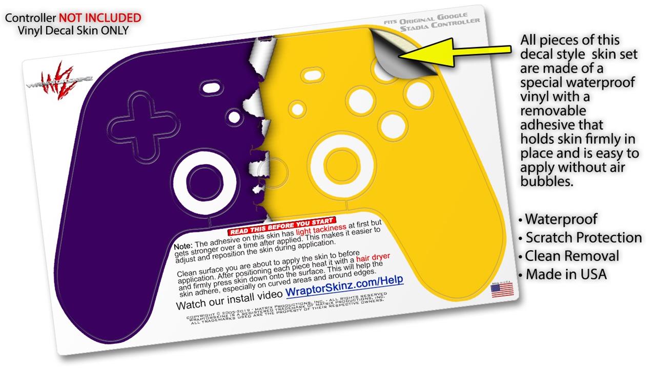 This product is in no way affiliated with or endorsed by Google. WraptorSkinz® skin wraps work with the Original Google Stadia version 1 Controller. Printed using superb photo quality designs and vibrant colors printed with special fade resistant inks that last even in direct sun for years. WraptorSkinz are a composite of two layers of commercial grade materials. The bottom layer is a soft, flexible vinyl with a special removable adhesive that is easily positioned, applied without air bubbles. Next, we print the bottom layer with UV protected, fade resistant inks that deliver superb photo quality designs in vibrant colors. Finally, we bond a professional grade laminate over the entire skin adding a glossy protective finish.