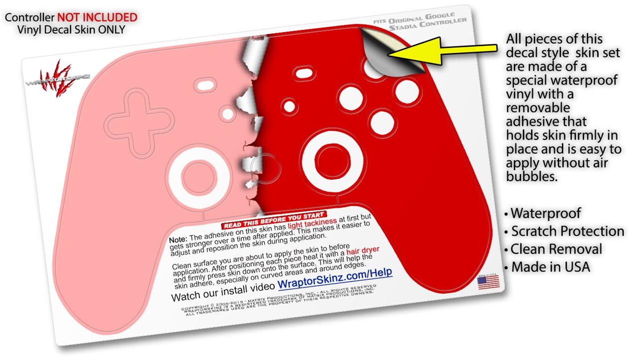 This product is in no way affiliated with or endorsed by Google. WraptorSkinz® skin wraps work with the Original Google Stadia version 1 Controller. Printed using superb photo quality designs and vibrant colors printed with special fade resistant inks that last even in direct sun for years. WraptorSkinz are a composite of two layers of commercial grade materials. The bottom layer is a soft, flexible vinyl with a special removable adhesive that is easily positioned, applied without air bubbles. Next, we print the bottom layer with UV protected, fade resistant inks that deliver superb photo quality designs in vibrant colors. Finally, we bond a professional grade laminate over the entire skin adding a glossy protective finish.