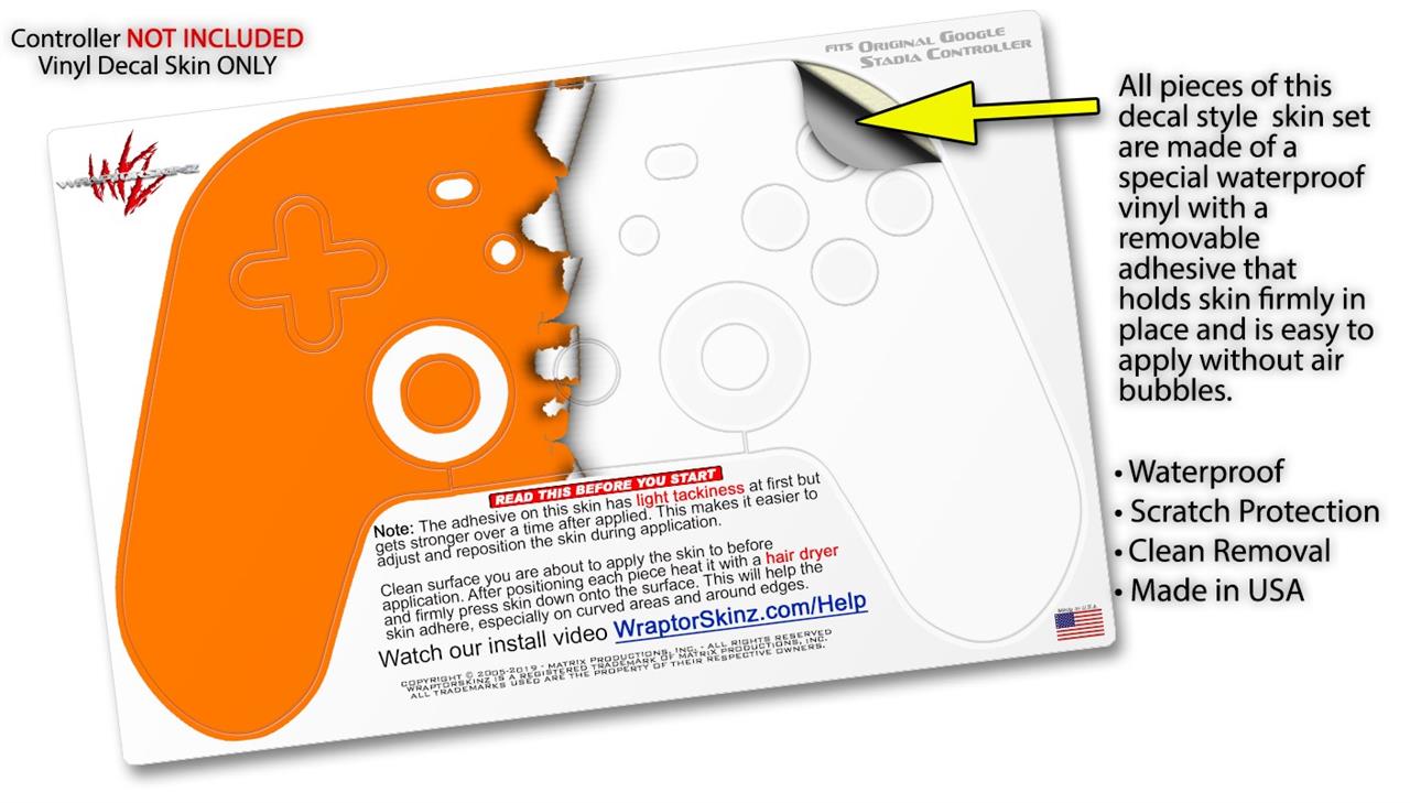 This product is in no way affiliated with or endorsed by Google. WraptorSkinz® skin wraps work with the Original Google Stadia version 1 Controller. Printed using superb photo quality designs and vibrant colors printed with special fade resistant inks that last even in direct sun for years. WraptorSkinz are a composite of two layers of commercial grade materials. The bottom layer is a soft, flexible vinyl with a special removable adhesive that is easily positioned, applied without air bubbles. Next, we print the bottom layer with UV protected, fade resistant inks that deliver superb photo quality designs in vibrant colors. Finally, we bond a professional grade laminate over the entire skin adding a glossy protective finish.