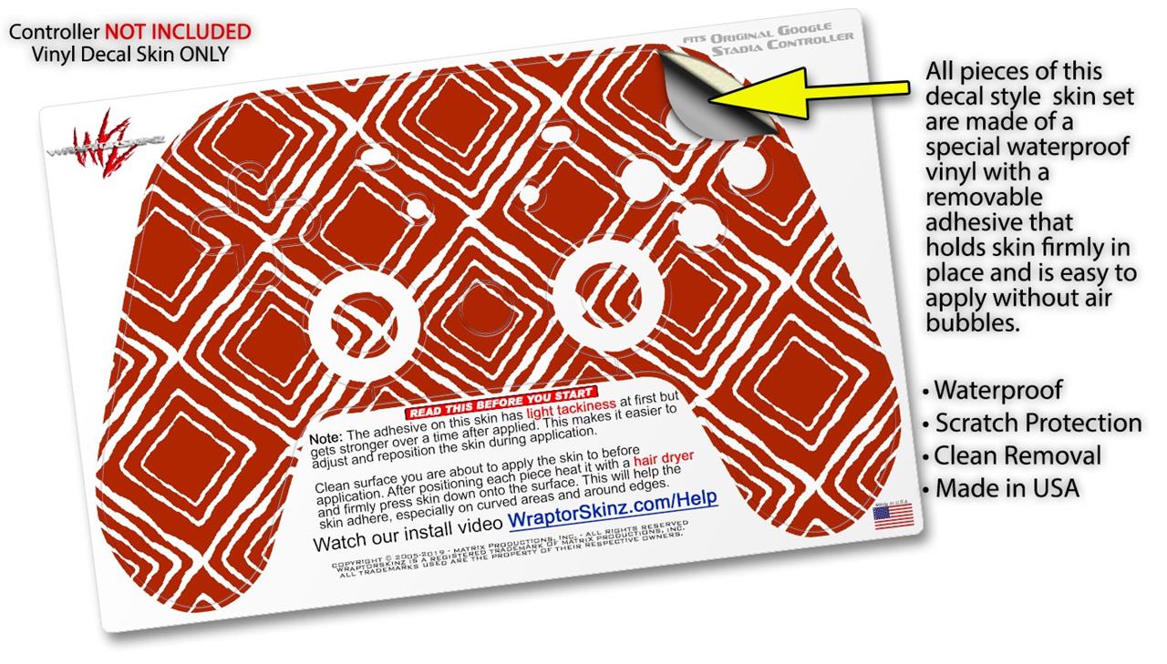 This product is in no way affiliated with or endorsed by Google. WraptorSkinz® skin wraps work with the Original Google Stadia version 1 Controller. Printed using superb photo quality designs and vibrant colors printed with special fade resistant inks that last even in direct sun for years. WraptorSkinz are a composite of two layers of commercial grade materials. The bottom layer is a soft, flexible vinyl with a special removable adhesive that is easily positioned, applied without air bubbles. Next, we print the bottom layer with UV protected, fade resistant inks that deliver superb photo quality designs in vibrant colors. Finally, we bond a professional grade laminate over the entire skin adding a glossy protective finish.