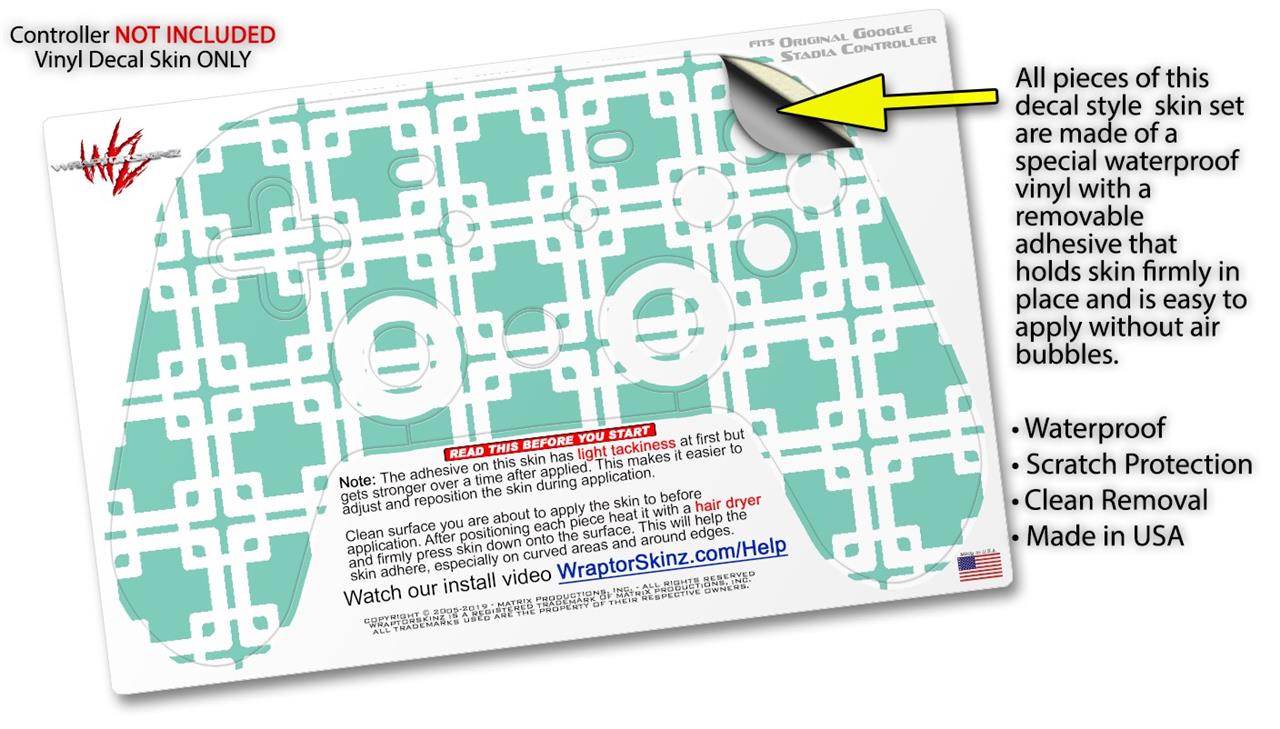 This product is in no way affiliated with or endorsed by Google. WraptorSkinz® skin wraps work with the Original Google Stadia version 1 Controller. Printed using superb photo quality designs and vibrant colors printed with special fade resistant inks that last even in direct sun for years. WraptorSkinz are a composite of two layers of commercial grade materials. The bottom layer is a soft, flexible vinyl with a special removable adhesive that is easily positioned, applied without air bubbles. Next, we print the bottom layer with UV protected, fade resistant inks that deliver superb photo quality designs in vibrant colors. Finally, we bond a professional grade laminate over the entire skin adding a glossy protective finish.