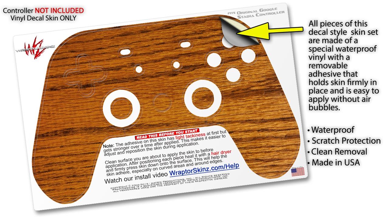 This product is in no way affiliated with or endorsed by Google. WraptorSkinz® skin wraps work with the Original Google Stadia version 1 Controller. Printed using superb photo quality designs and vibrant colors printed with special fade resistant inks that last even in direct sun for years. WraptorSkinz are a composite of two layers of commercial grade materials. The bottom layer is a soft, flexible vinyl with a special removable adhesive that is easily positioned, applied without air bubbles. Next, we print the bottom layer with UV protected, fade resistant inks that deliver superb photo quality designs in vibrant colors. Finally, we bond a professional grade laminate over the entire skin adding a glossy protective finish.