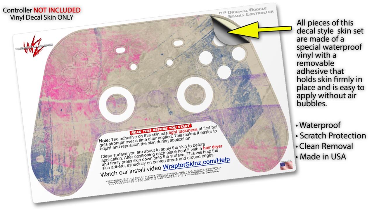 This product is in no way affiliated with or endorsed by Google. WraptorSkinz® skin wraps work with the Original Google Stadia version 1 Controller. Printed using superb photo quality designs and vibrant colors printed with special fade resistant inks that last even in direct sun for years. WraptorSkinz are a composite of two layers of commercial grade materials. The bottom layer is a soft, flexible vinyl with a special removable adhesive that is easily positioned, applied without air bubbles. Next, we print the bottom layer with UV protected, fade resistant inks that deliver superb photo quality designs in vibrant colors. Finally, we bond a professional grade laminate over the entire skin adding a glossy protective finish.