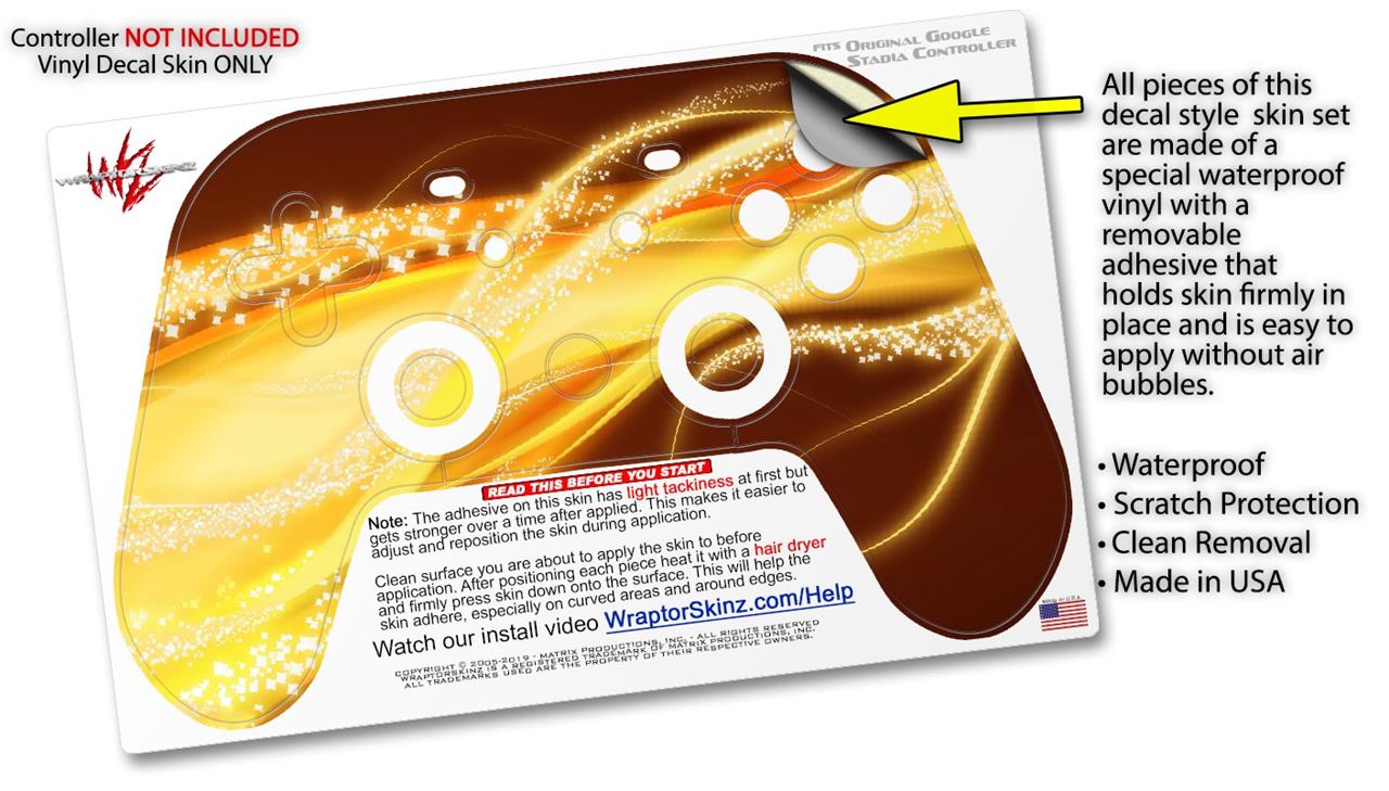 This product is in no way affiliated with or endorsed by Google. WraptorSkinz® skin wraps work with the Original Google Stadia version 1 Controller. Printed using superb photo quality designs and vibrant colors printed with special fade resistant inks that last even in direct sun for years. WraptorSkinz are a composite of two layers of commercial grade materials. The bottom layer is a soft, flexible vinyl with a special removable adhesive that is easily positioned, applied without air bubbles. Next, we print the bottom layer with UV protected, fade resistant inks that deliver superb photo quality designs in vibrant colors. Finally, we bond a professional grade laminate over the entire skin adding a glossy protective finish.