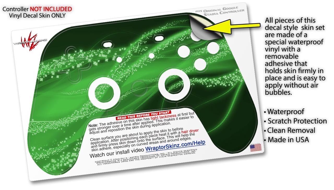This product is in no way affiliated with or endorsed by Google. WraptorSkinz® skin wraps work with the Original Google Stadia version 1 Controller. Printed using superb photo quality designs and vibrant colors printed with special fade resistant inks that last even in direct sun for years. WraptorSkinz are a composite of two layers of commercial grade materials. The bottom layer is a soft, flexible vinyl with a special removable adhesive that is easily positioned, applied without air bubbles. Next, we print the bottom layer with UV protected, fade resistant inks that deliver superb photo quality designs in vibrant colors. Finally, we bond a professional grade laminate over the entire skin adding a glossy protective finish.