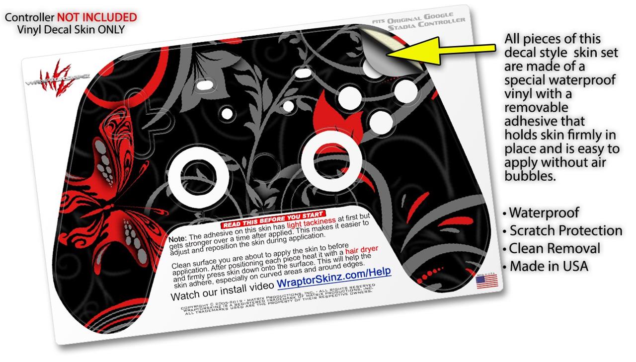 This product is in no way affiliated with or endorsed by Google. WraptorSkinz® skin wraps work with the Original Google Stadia version 1 Controller. Printed using superb photo quality designs and vibrant colors printed with special fade resistant inks that last even in direct sun for years. WraptorSkinz are a composite of two layers of commercial grade materials. The bottom layer is a soft, flexible vinyl with a special removable adhesive that is easily positioned, applied without air bubbles. Next, we print the bottom layer with UV protected, fade resistant inks that deliver superb photo quality designs in vibrant colors. Finally, we bond a professional grade laminate over the entire skin adding a glossy protective finish.