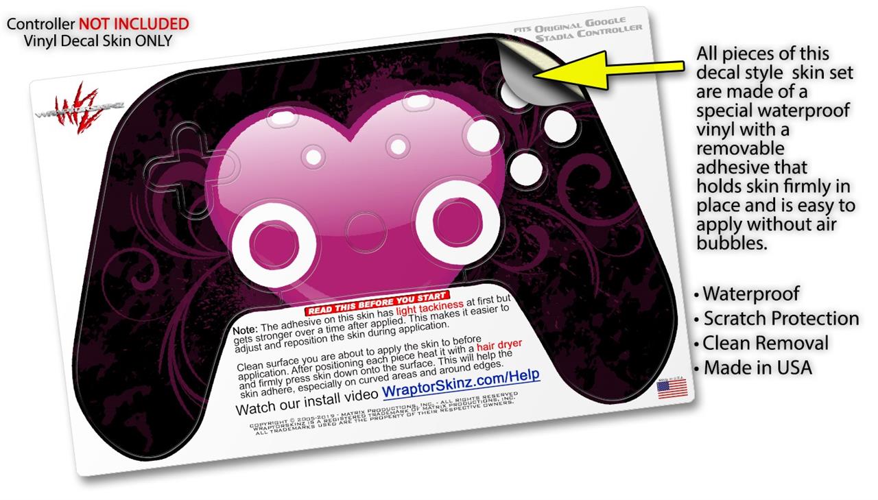 This product is in no way affiliated with or endorsed by Google. WraptorSkinz® skin wraps work with the Original Google Stadia version 1 Controller. Printed using superb photo quality designs and vibrant colors printed with special fade resistant inks that last even in direct sun for years. WraptorSkinz are a composite of two layers of commercial grade materials. The bottom layer is a soft, flexible vinyl with a special removable adhesive that is easily positioned, applied without air bubbles. Next, we print the bottom layer with UV protected, fade resistant inks that deliver superb photo quality designs in vibrant colors. Finally, we bond a professional grade laminate over the entire skin adding a glossy protective finish.