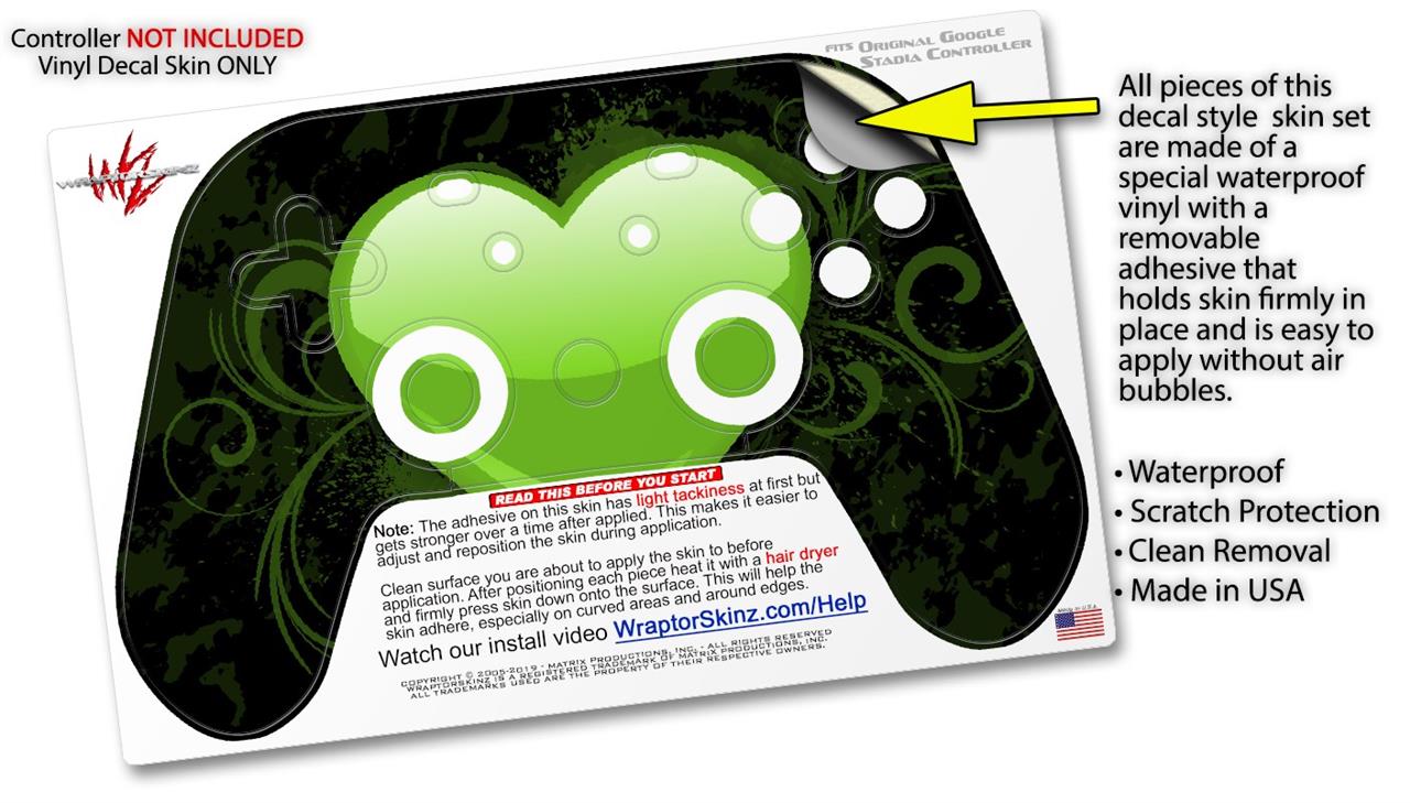 This product is in no way affiliated with or endorsed by Google. WraptorSkinz® skin wraps work with the Original Google Stadia version 1 Controller. Printed using superb photo quality designs and vibrant colors printed with special fade resistant inks that last even in direct sun for years. WraptorSkinz are a composite of two layers of commercial grade materials. The bottom layer is a soft, flexible vinyl with a special removable adhesive that is easily positioned, applied without air bubbles. Next, we print the bottom layer with UV protected, fade resistant inks that deliver superb photo quality designs in vibrant colors. Finally, we bond a professional grade laminate over the entire skin adding a glossy protective finish.