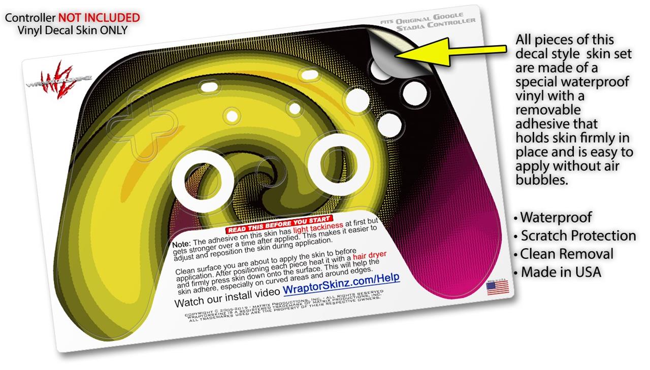 This product is in no way affiliated with or endorsed by Google. WraptorSkinz® skin wraps work with the Original Google Stadia version 1 Controller. Printed using superb photo quality designs and vibrant colors printed with special fade resistant inks that last even in direct sun for years. WraptorSkinz are a composite of two layers of commercial grade materials. The bottom layer is a soft, flexible vinyl with a special removable adhesive that is easily positioned, applied without air bubbles. Next, we print the bottom layer with UV protected, fade resistant inks that deliver superb photo quality designs in vibrant colors. Finally, we bond a professional grade laminate over the entire skin adding a glossy protective finish.