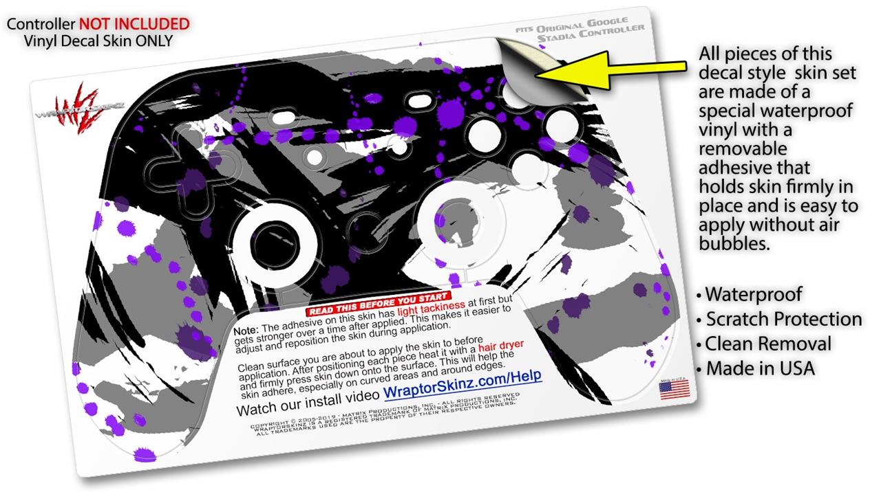 This product is in no way affiliated with or endorsed by Google. WraptorSkinz® skin wraps work with the Original Google Stadia version 1 Controller. Printed using superb photo quality designs and vibrant colors printed with special fade resistant inks that last even in direct sun for years. WraptorSkinz are a composite of two layers of commercial grade materials. The bottom layer is a soft, flexible vinyl with a special removable adhesive that is easily positioned, applied without air bubbles. Next, we print the bottom layer with UV protected, fade resistant inks that deliver superb photo quality designs in vibrant colors. Finally, we bond a professional grade laminate over the entire skin adding a glossy protective finish.