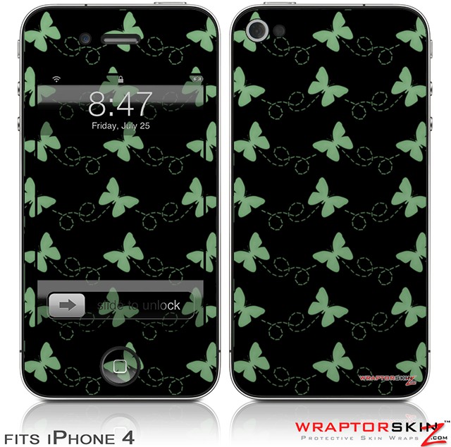 iPhone 4 Skin - Pastel Butterflies Green on Black (DOES NOT fit newer iPhone 4S)